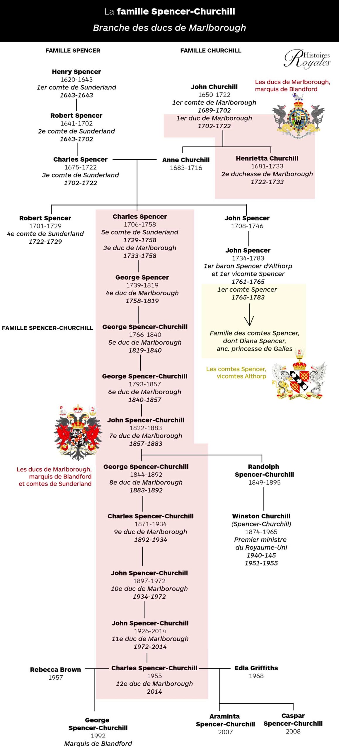 John Churchill, général anglais et homme d’État, reçut le titre de duc de Marlborough en 1702, pour sa participation aux campagnes lors de la guerre de Succession espagnole. Par ailleurs, l’empereur Léopold 1er lui octroya le titre de prince du Saint-Empire avec apanage sur la petite principauté de Mindelheim. C’est la raison pour laquelle figure aujourd’hui l’aigle impérial bicéphal sur les armoiries familiales, ce qui est extrêmement rare sur des armoiries de la noblesse britannique. La fille du 1er duc de Marlborough, Henrietta, obtint une autorisation exceptionnelle du parlement anglais d’hériter du titre de noblesse de son père, faisant d’elle la 2e duchesse de Marlborough, à la mort de John Churchill en 1722. Le fils d’Henrietta, considéré comme son héritier, mourut deux ans avant sa mère, rendant la succession compliquée. Le titre de duc de Marlborough sera transmis en 1733 au neveu d’Henrietta, Charles Spencer, 3e comte de Sunderland. Les descendants de ce dernier adopteront le double patronyme Spencer-Churchill.