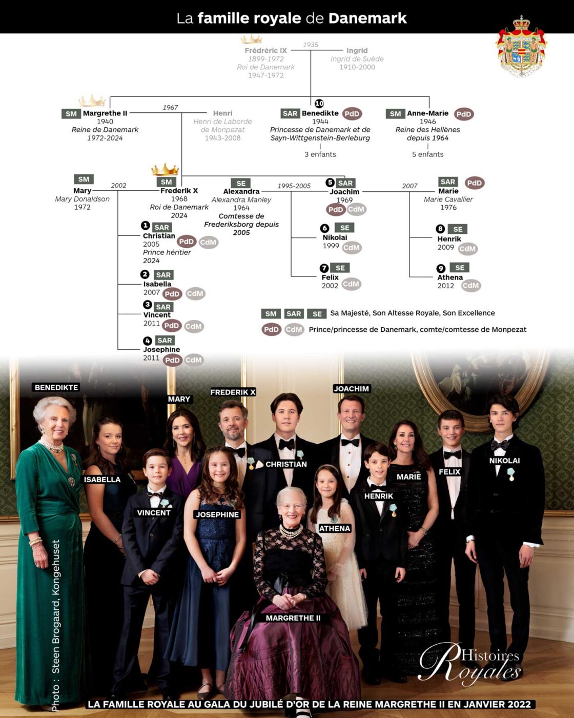 La reine Margrethe, qui a abdiqué en janvier 2024 en faveur de son fils aîné, a eu deux fils, le roi Frederik X et le prince Joachim. Le roi Frederik et la reine Mary ont quatre enfants, dont les deux derniers sont des jumeaux nés 2011. Le prince Joachim a eu des fils avec sa première et épouse et deux enfants avec sa deuxième épouse, la princesse Marie. Le comte Henrik est né en 2009 et la comtesse Athena est née en 2012. Athena est donc la plus jeune descendante de la reine Margrethe et aussi la plus jeune personne à figurer dans l’ordre de succession au trône. Ahtena occupe actuellement la 9e place.