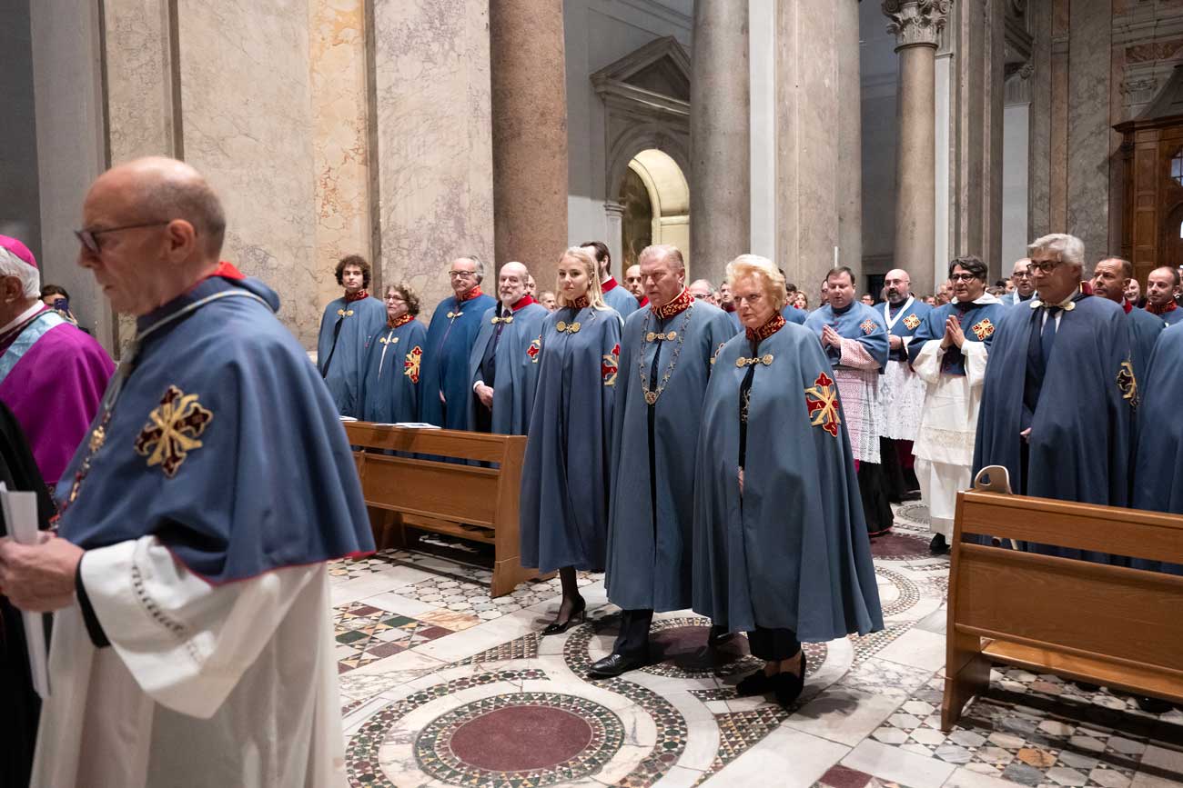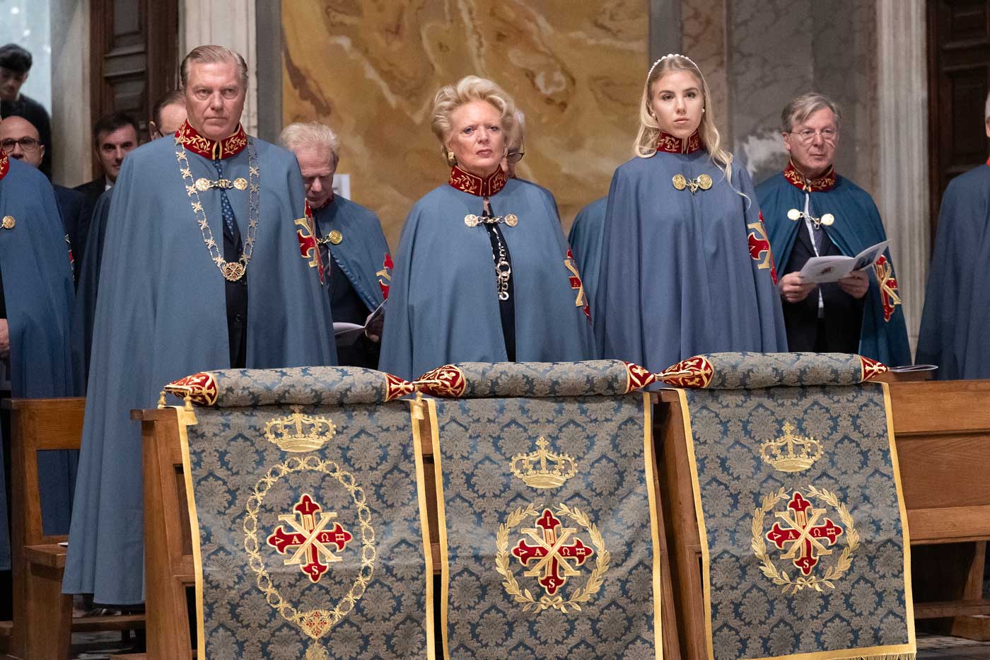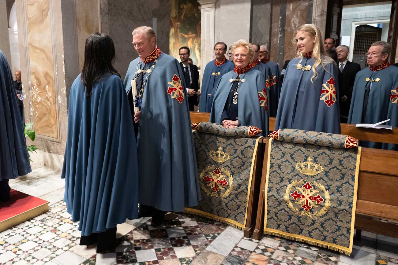 De nombreux représentants de familles royales étrangères ont assisté à la messe d’investiture des nouveaux membres des ordres dynastiques, à la basilique papale Sainte-Croix-de-Jérusalem. Cette église fait partie de l’itinéraire traditionnellement suivi par les pèlerins lors des années saintes. Son histoire remonte à une époque très ancienne, liée à Hélène, la mère de l’empereur Constantin. Au début du 4e siècle, Hélène aurait ramené un morceau de la Croix et un édifice aurait été construit pour l’abriter. L’empereur Constantin a une importance particulière puisqu’il aurait aussi inspiré la création de l’ordre constantinien de Saint-Georges.
