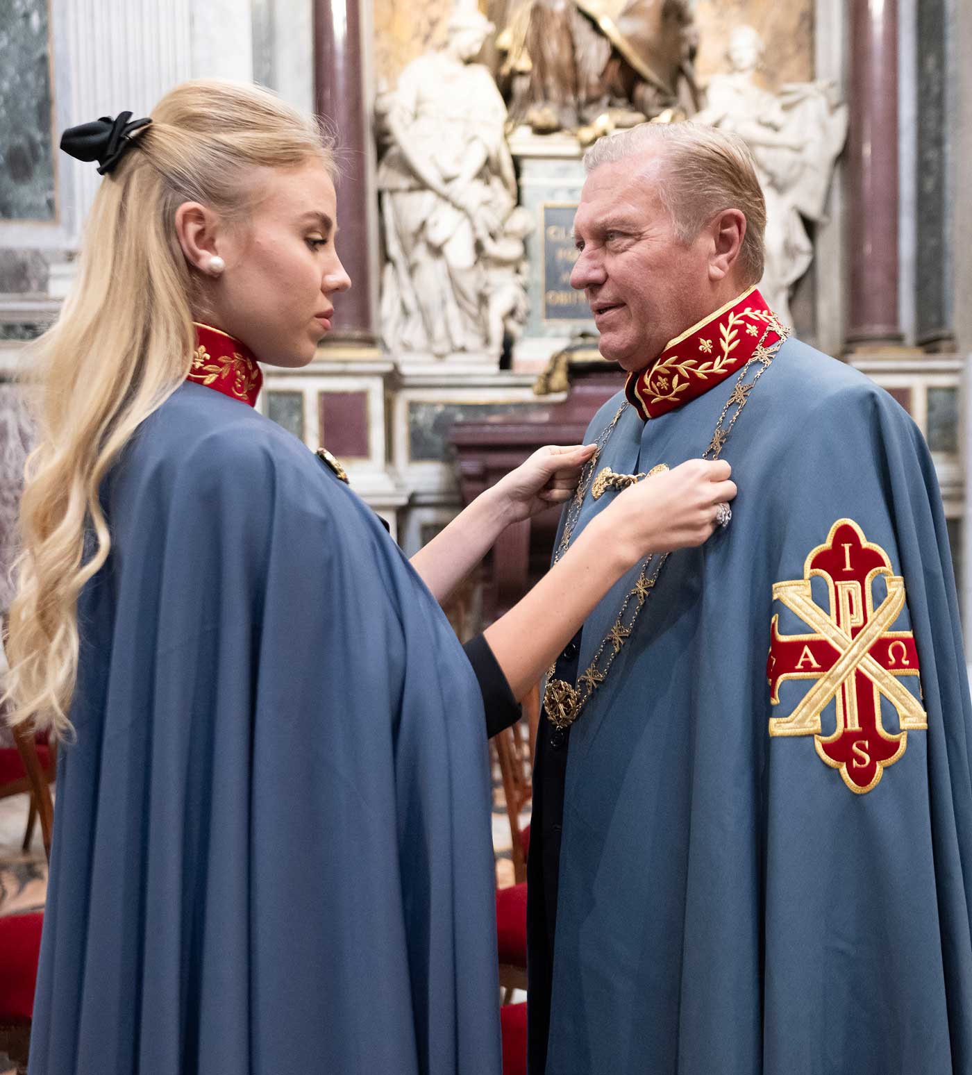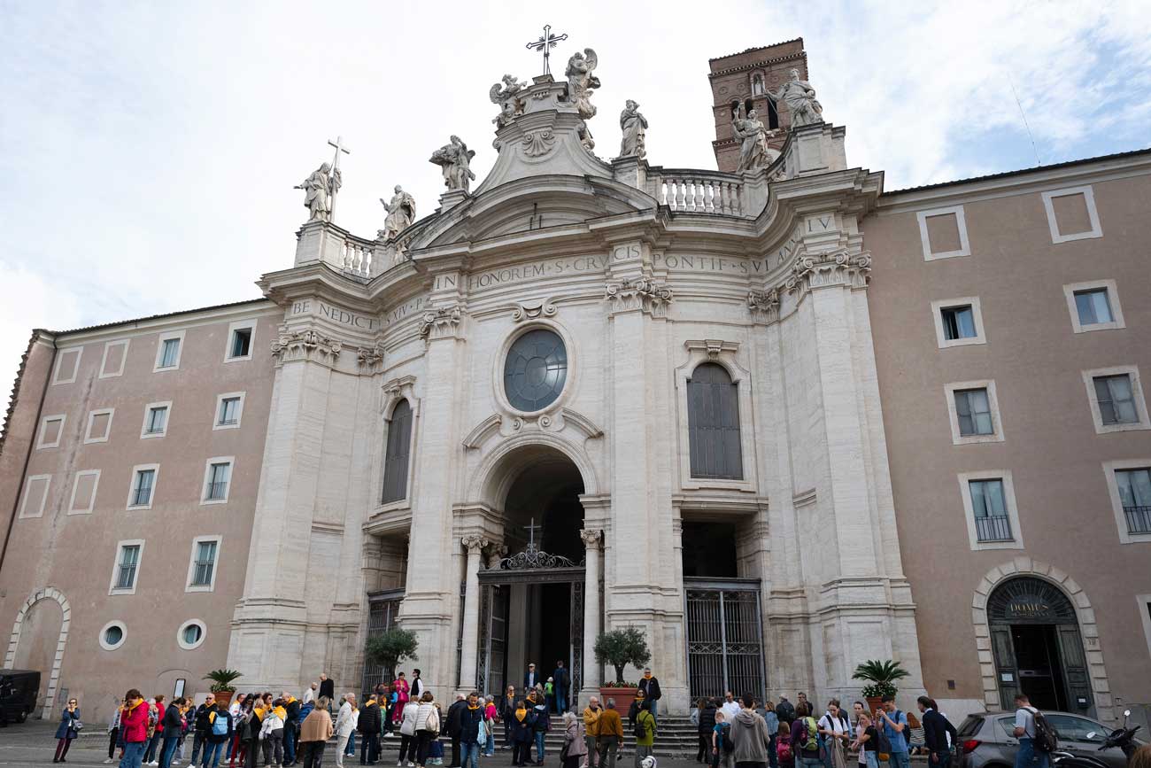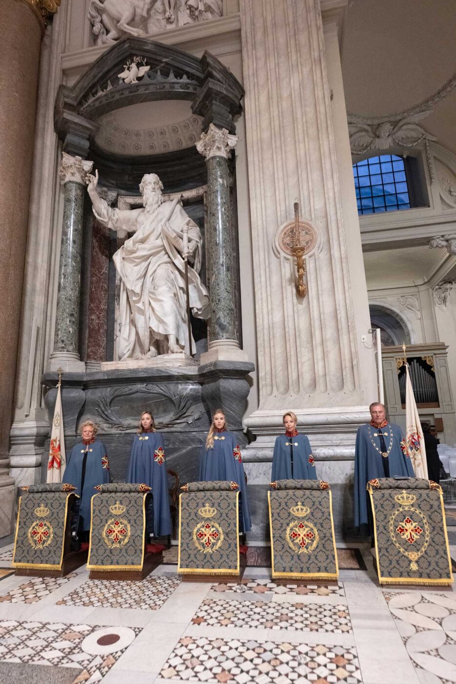 De nombreux représentants de familles royales étrangères ont assisté à la messe d’investiture des nouveaux membres des ordres dynastiques, à la basilique papale Sainte-Croix-de-Jérusalem. Cette église fait partie de l’itinéraire traditionnellement suivi par les pèlerins lors des années saintes. Son histoire remonte à une époque très ancienne, liée à Hélène, la mère de l’empereur Constantin. Au début du 4e siècle, Hélène aurait ramené un morceau de la Croix et un édifice aurait été construit pour l’abriter. L’empereur Constantin a une importance particulière puisqu’il aurait aussi inspiré la création de l’ordre constantinien de Saint-Georges.