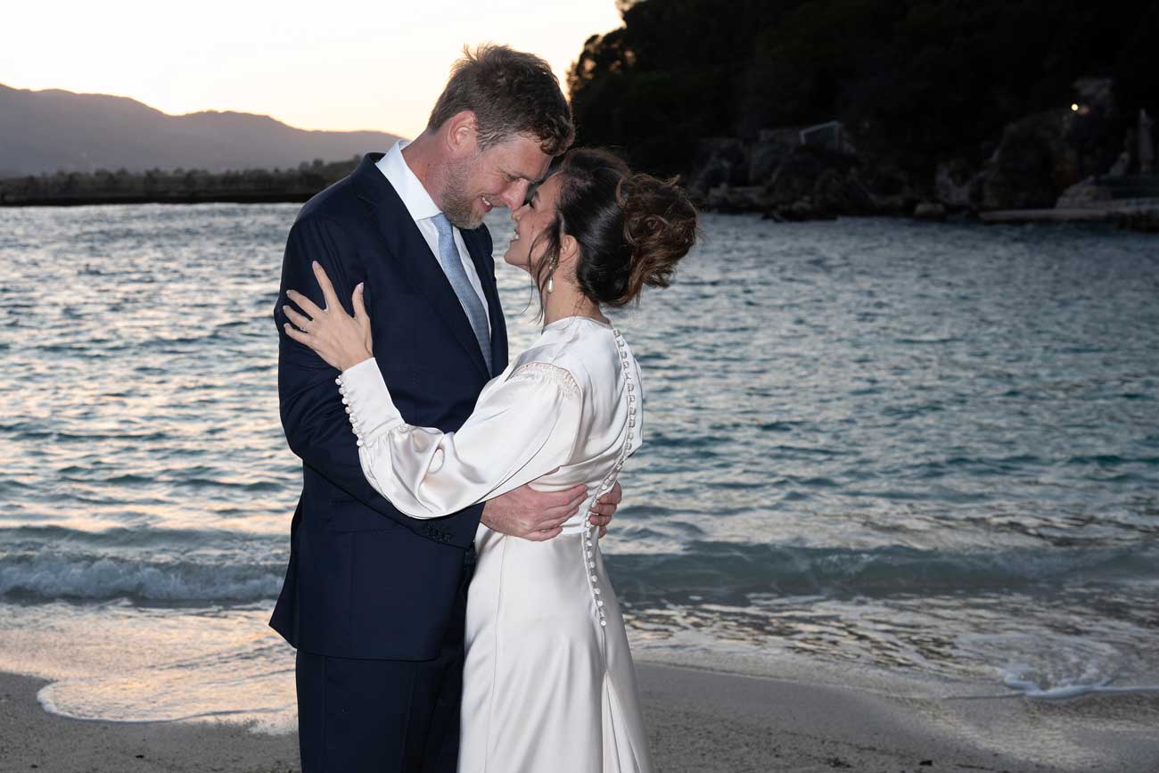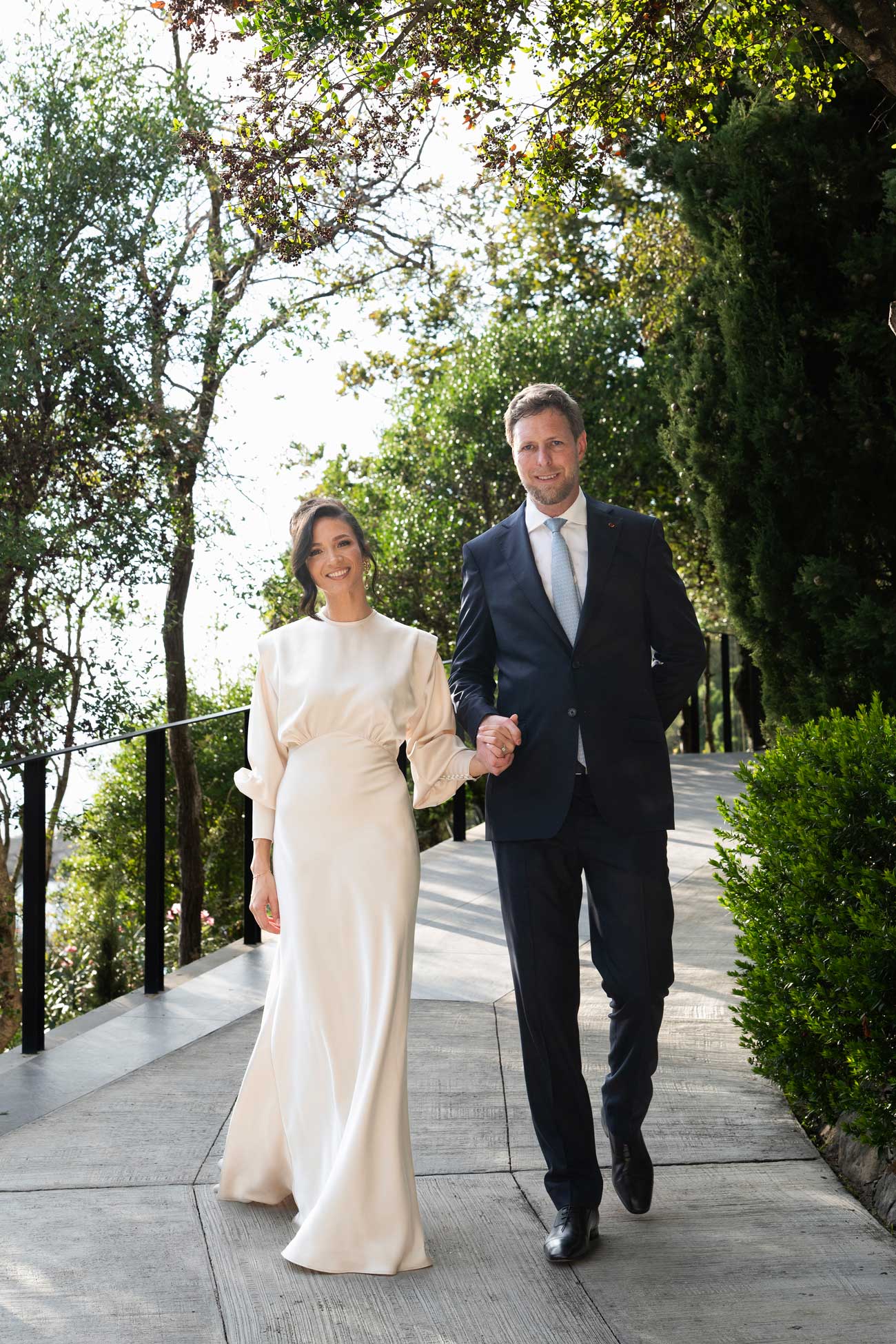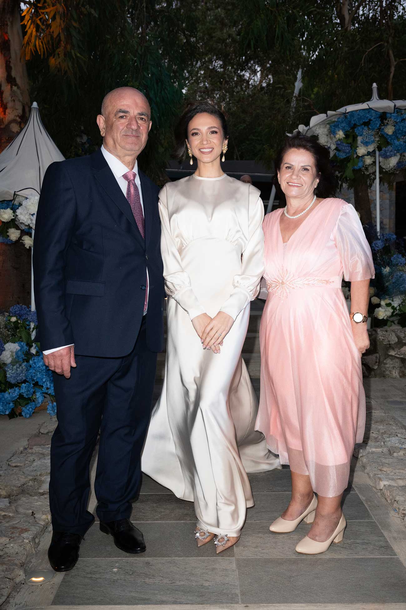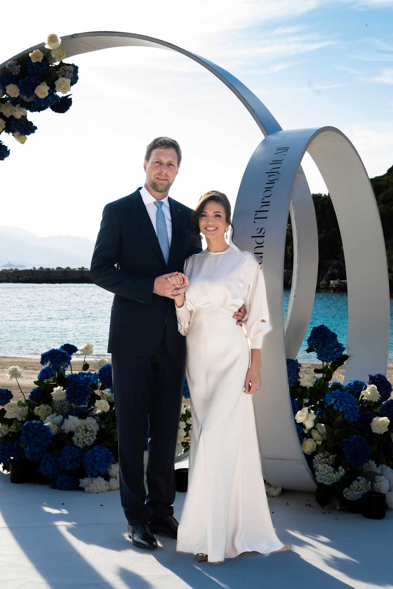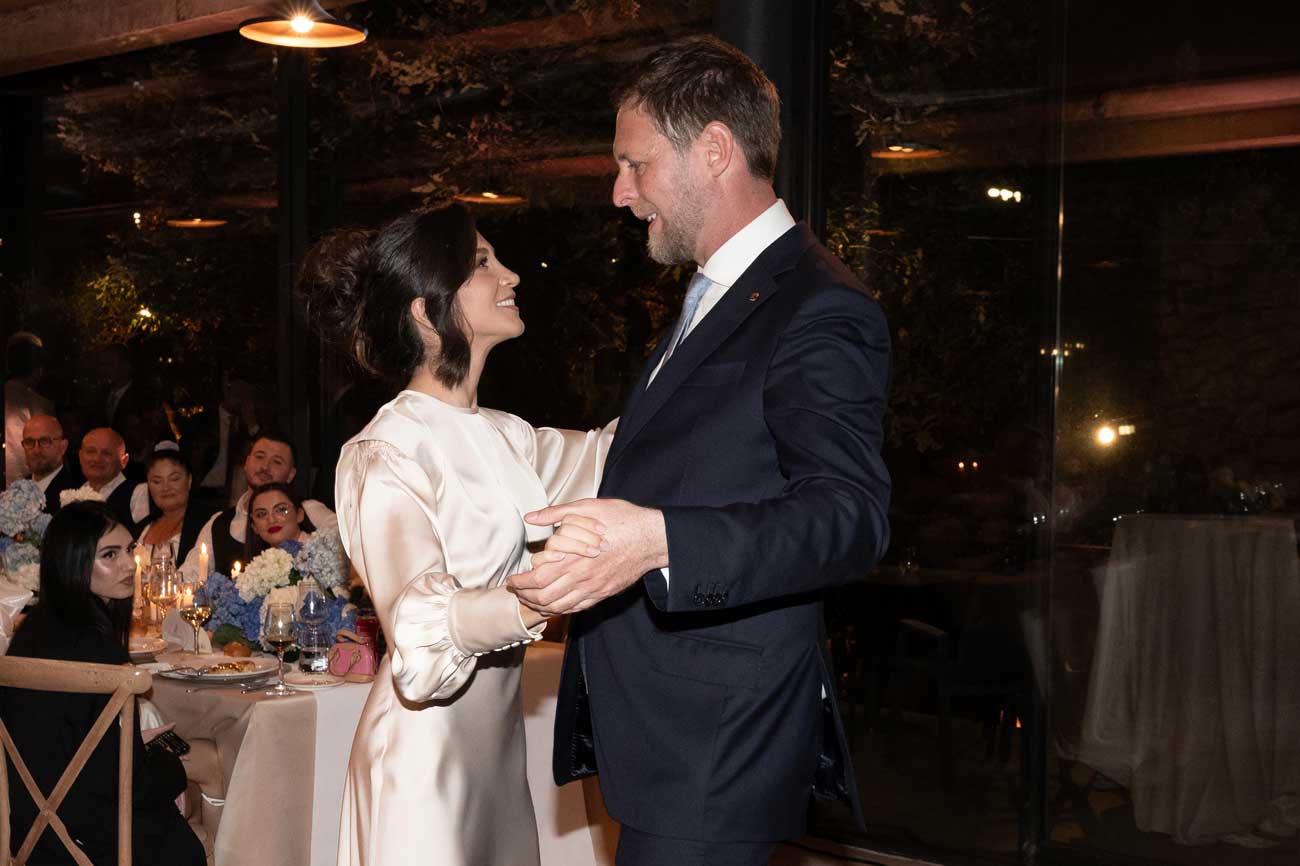 Après une séance photo sur cette plage de sable blanc, les deux amoureux ont rejoint leurs invités à l’hôtel Kep Merli. Le prince Leka II, fils unique du prince héritier Leka, lui-même fils unique du roi Zog 1er, portait un élégant costume bleu marine et une cravate bleu pâle. Blerta Celibasha, photographe de profession, portait une robe ivoire en satin avec une traîne. Cette robe à la coupe épurée et moderne, avec une taille marquée, longues manches et épaules légèrement structurées, est signée de la maison albanaise T&N couture.