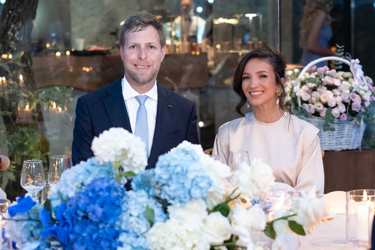 Les fiancés à table, parmi les fleurs bleues et blanches (Photo : David Nivière)