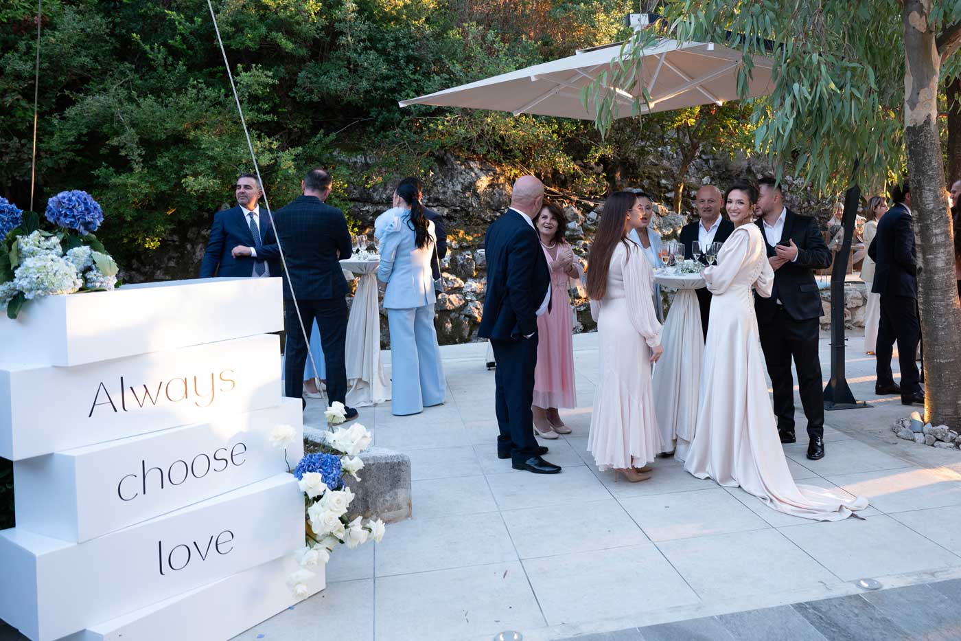 C’est dans ce décor paradisiaque, dans le parc national de Butrint, que le prince héritier Leka et Blerta Celibashi ont partagé leur bonheur, ce 10 octobre 2025. Sur la plage, des anneaux entrelacés étaient érigés telle une sculpture symbolisant leur amour. « L’amour résiste à tout », peut-on lire sur inscrit en anglais sur l’un des années. D’autres messages romantiques rappelaient aux invités que l’amour prime sur tout. À l’entrée de l’hôtel, un panneau portait l’inscription « Toujours choisir l’amour » et les nappes des tables portaient l’inscription « Là où il y a de l’amour, il y a de la vie ».