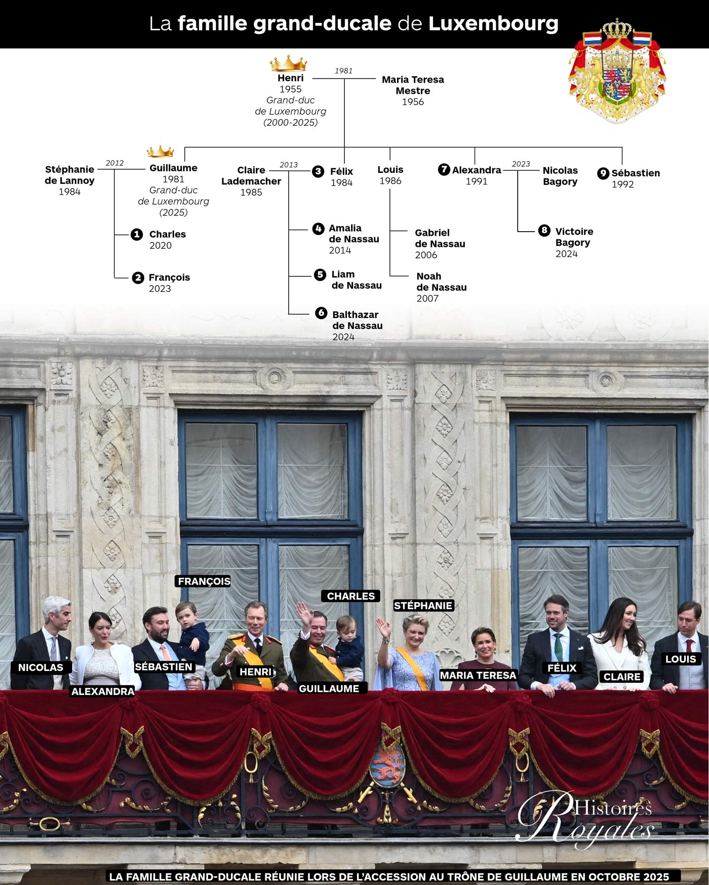 La famille grand-ducale au grand complet – les frères et sœurs d’Henri ainsi que les frères et sœurs de Guillaume – ont assisté aux différents événements organisés lors de ce changement de trône. Les souverains des monarchies du Benelux étaient également présents avec leur héritière. Le roi Philippe et la reine Mathilde de Belgique étaient accompagnés de la princesse Élisabeth, duchesse de Brabant, et le roi Willem-Alexander des Pays-Bas et la reine Máxima étaient accompagnés de la princesse Catharina-Amalia, princesse d’Orange. Du côté luxembourgeois, l’héritier du trône a un nouveau visage. Le fils aîné du nouveau Grand-Duc devient à son tour l’héritier du trône.