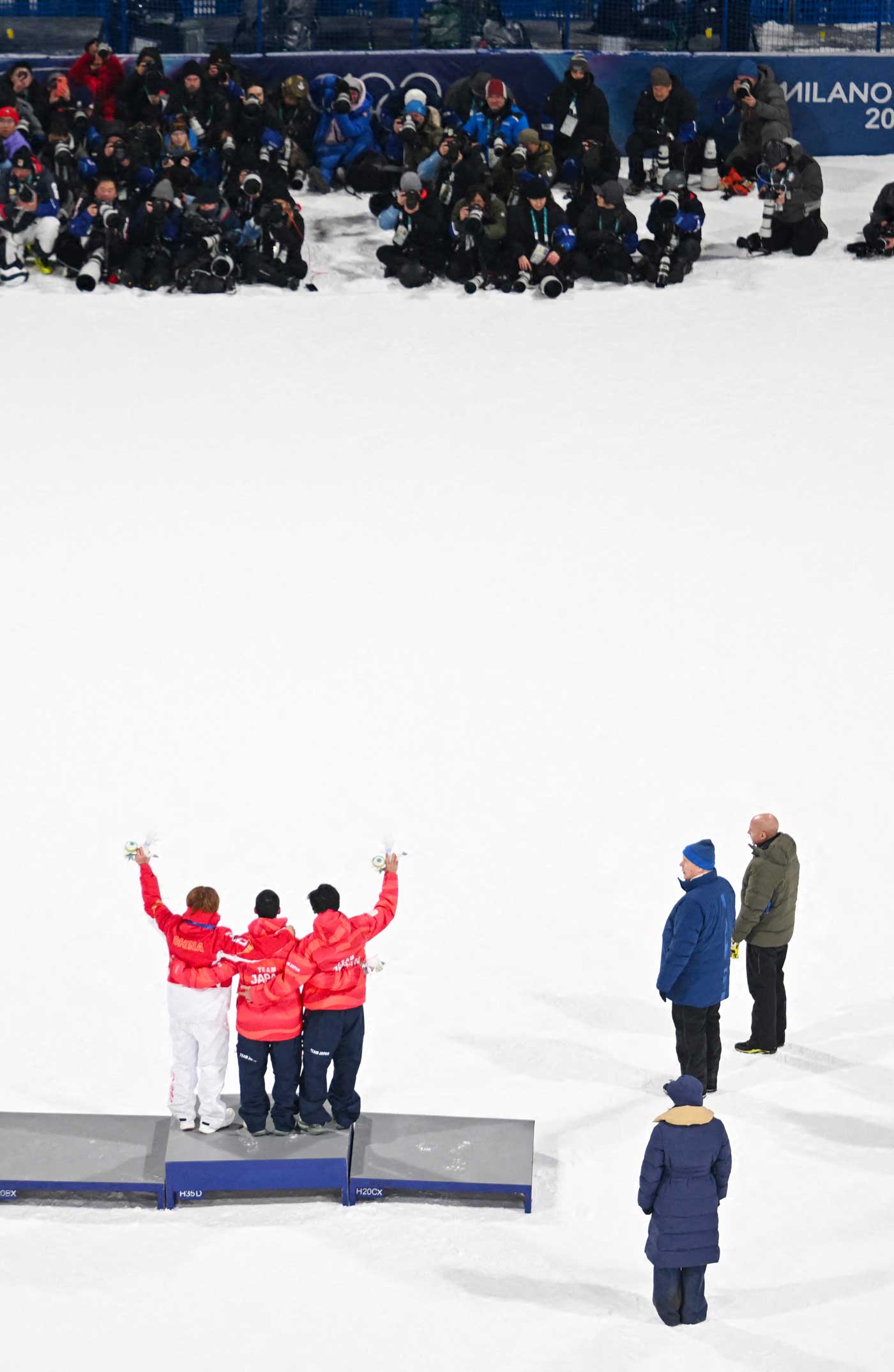 Les trois snwoboardeurs présentent leurs médailles aux journalistes. Le prince Albert II se tient près du podium (avec le bonnet à droite de la photo) (Photo : Xia Yifang/Xinhua/ABACAPRESS.COM)