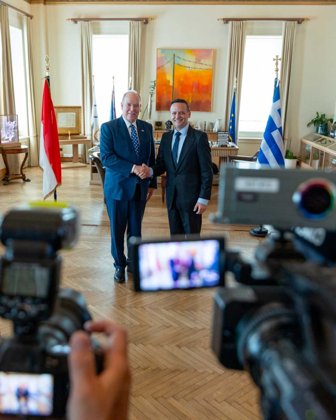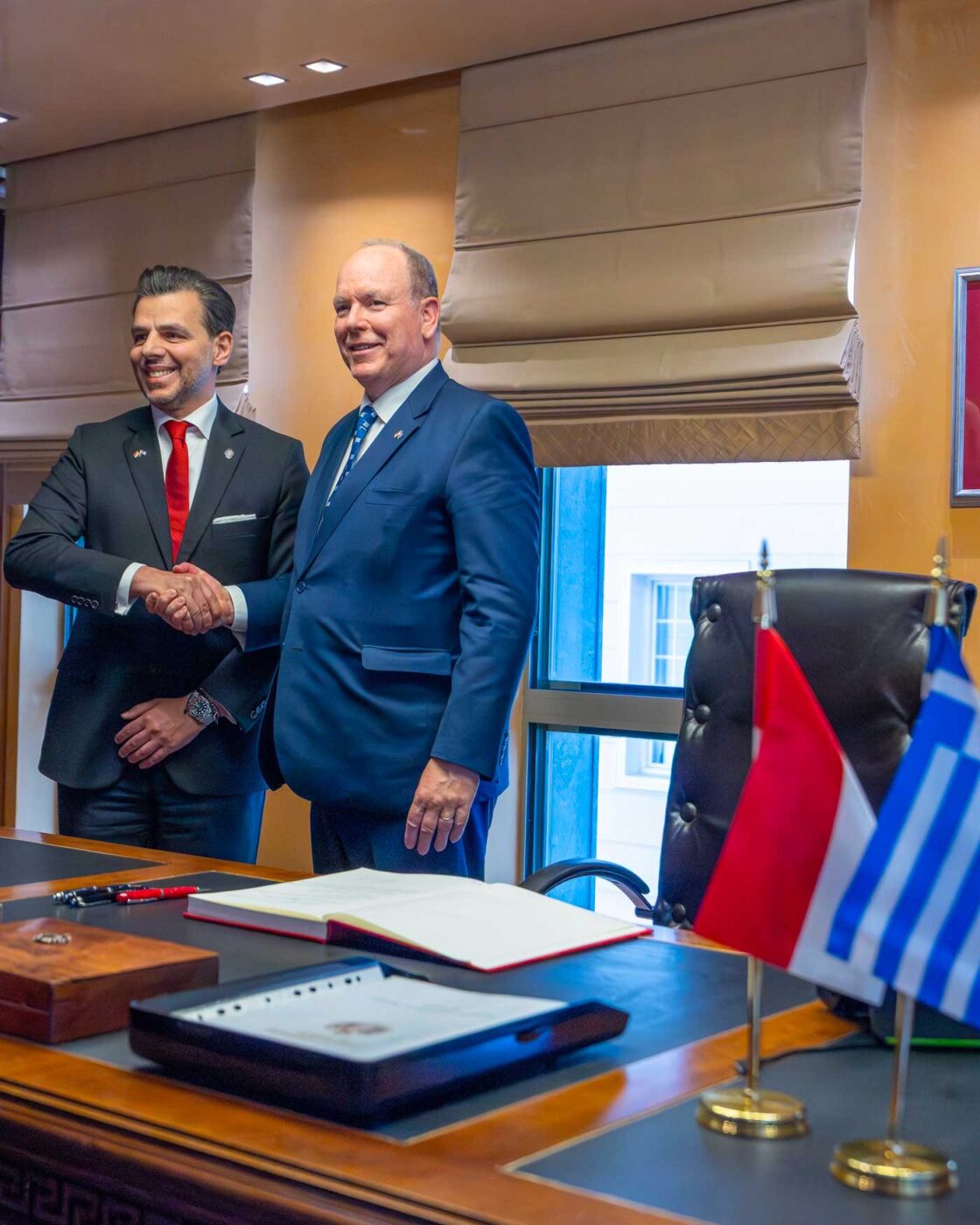 La ministre monégasque des Relations extérieures et de la Coopération, Isabelle Berro-Amadeï, et le vice-premier ministre grec, Kostis Hatzidakis, étaient présents lors de cet événement qui comprenait aussi une visite du bâtiment. Le prince Albert a visité les bureaux, signé le livre d’or et participé à une séance photo officielle.