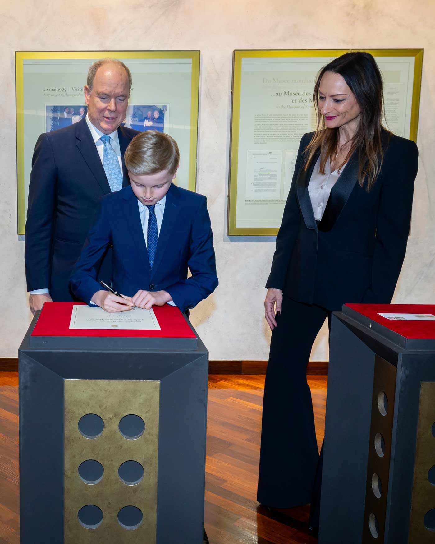 Le prince Albert II et son fils ont visité l’exposition, puis ils ont signé le livre d’or. Le souverain et le marquis des Baux ont aussi oblitéré l’enveloppe « Premier Jour », sur laquelle sont collés des timbres spéciaux, émis à l’occasion de l’anniversaire du musée. Le prince Albert II est lui-même détenteur d’une des plus grandes collections de timbres au monde. Son aïeul, le prince souverain Albert 1er a acheté la collection du révérend G.G. Barbier, un pasteur anglais qui avait réuni une importante collection. Cette collection a été transmise aux successeurs d’Albert 1er et enrichie.