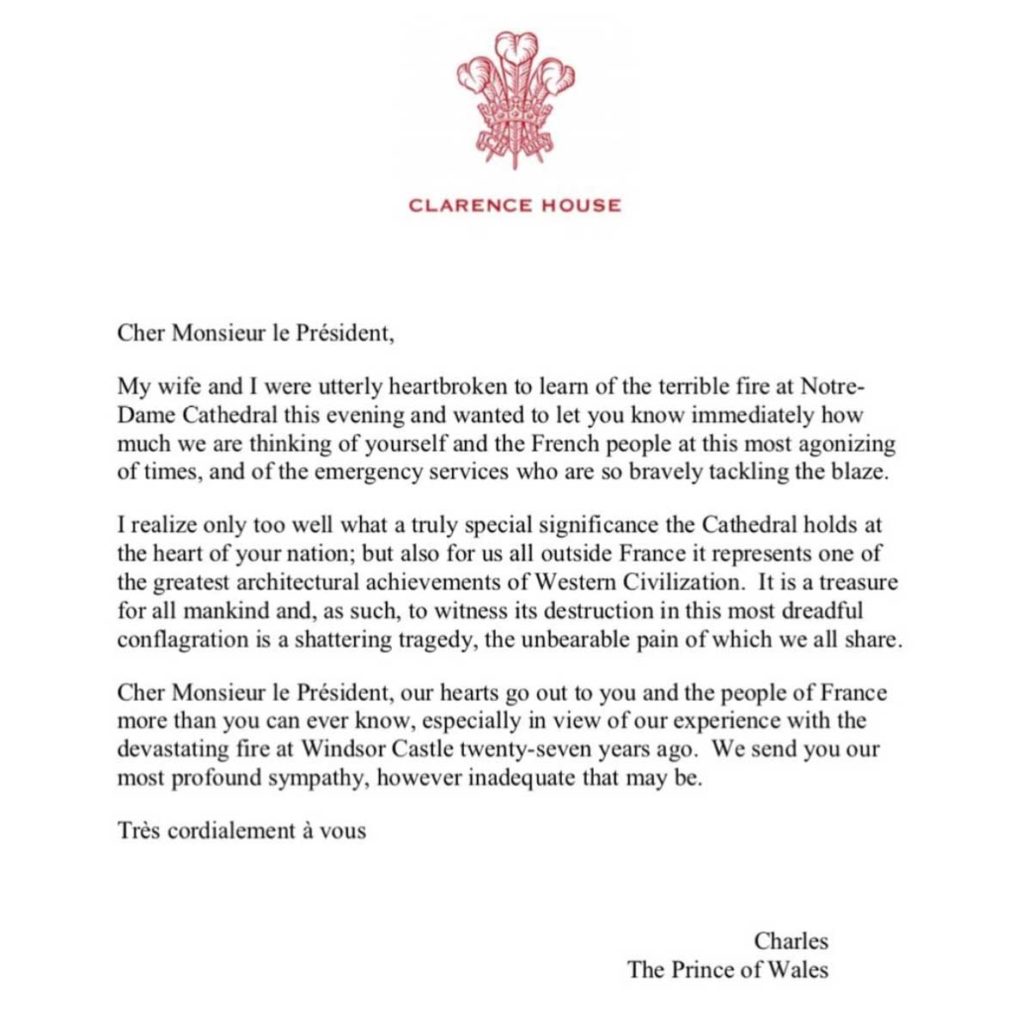 Cher Monsieur le Président, nos cœurs vous accompagne vous et le peuple français plus que vous ne puissiez l’imaginer, en particulier parce que nous avons vécu la terrible expérience d’un incendie qui a dévasté le château de Windsor, il y a 27 ans. »
