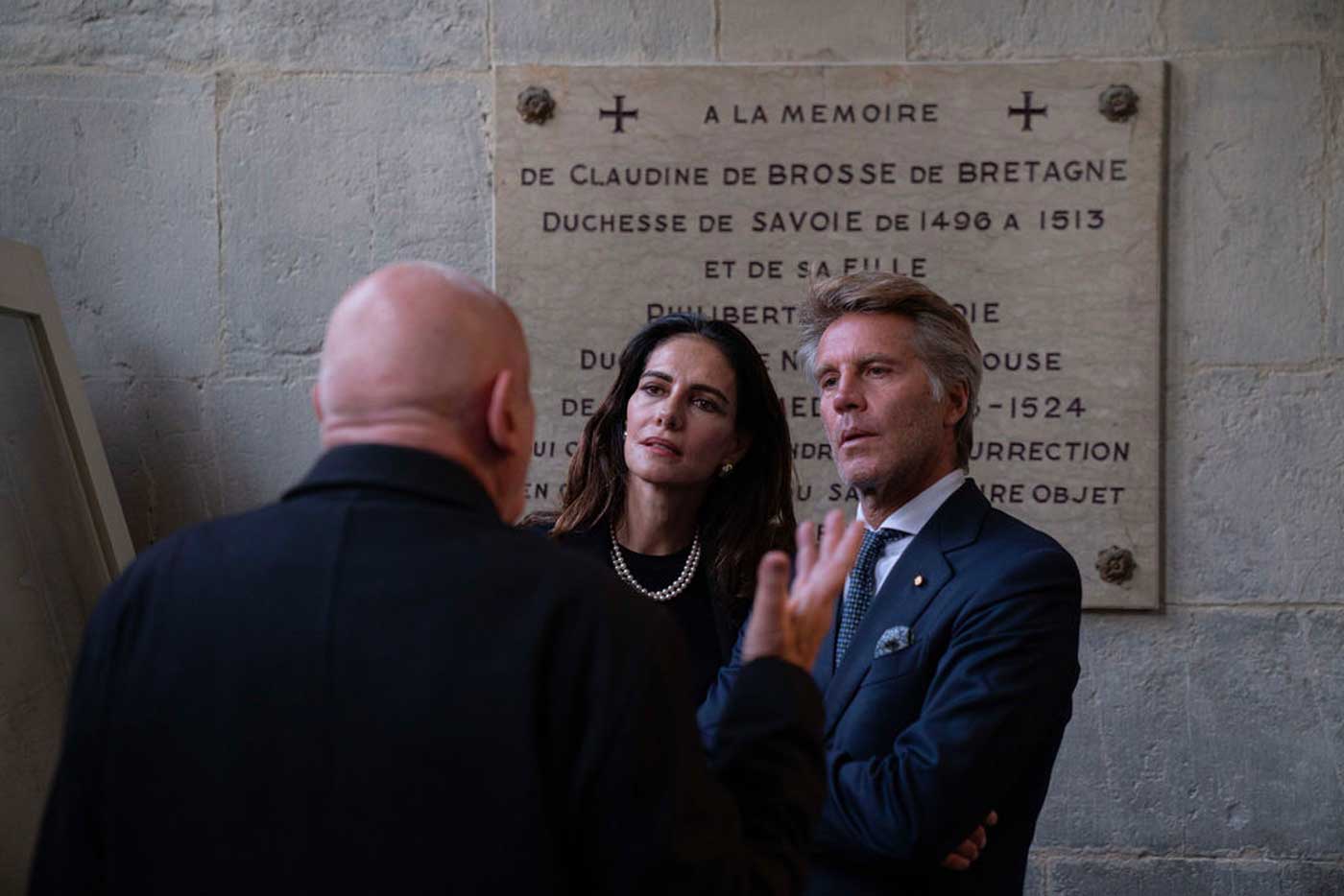 Christian Regat, officier de l’ordre des Saints-Maurice-et-Lazare, et Mgr Thibault Verny, archevêque de Chambéry, évêque de Maurienne et de Tarentaise, ainsi que le chanoine Didier Milani, représentant de l’évêque d’Annecy, ont guidé le prince Emmanuel-Philibert de Savoie et sa compagne. Lors de cette visite, Emmanuel-Philibert et Adriana se sont longuement recueillis devant une reproduction du Saint-Suaire. Ce linceul fut abrité en ces murs de 1502 à 1578 avant d’être transféré à Turin. La famille de Savoie est restée propriétaire du célèbre linceul durant des siècles. Ce n’est qu’en 1983 que le roi Humbert II, le grand-père du prince Emmanuel-Philibert, s’en est séparé et l’a remis au pape Jean-Paul II.