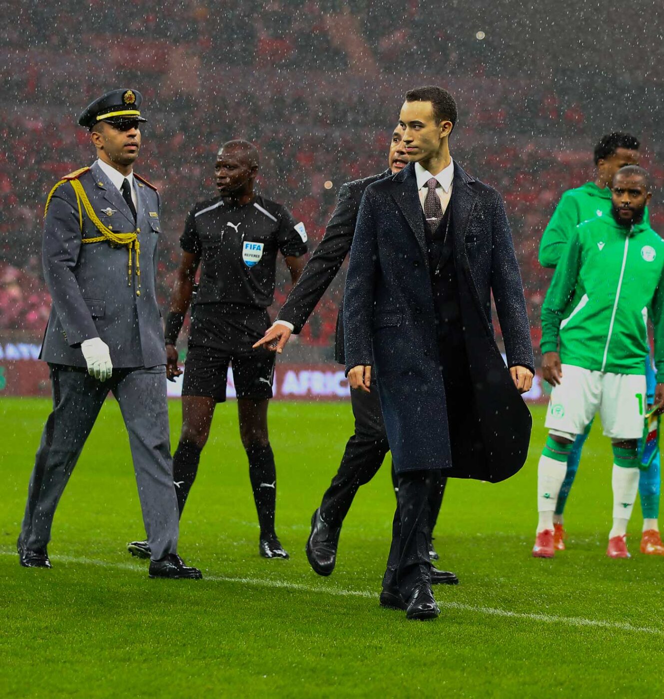 Le fils du roi Mohammed VI sous la pluie, sur la pelouse du stade de Rabat ce 21 décembre 2025 (Photo : Hamza Bouhara/ABACAPRESS.COM)