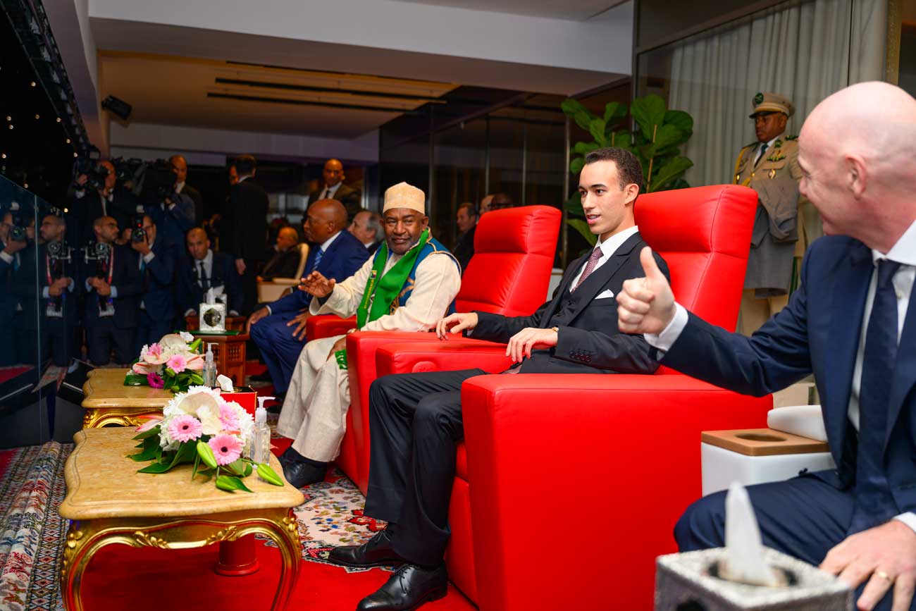 Le prince héritier Moulay El Hassan assiste à la cérémonie d’ouverture de la CAN et au premier match de la compétition depuis la tribune royale du stade de Rabat, assis entre le président des Comores, Azali Assoumani, et le président de la FIFA, Gianni Infantino (Photo : MAP)