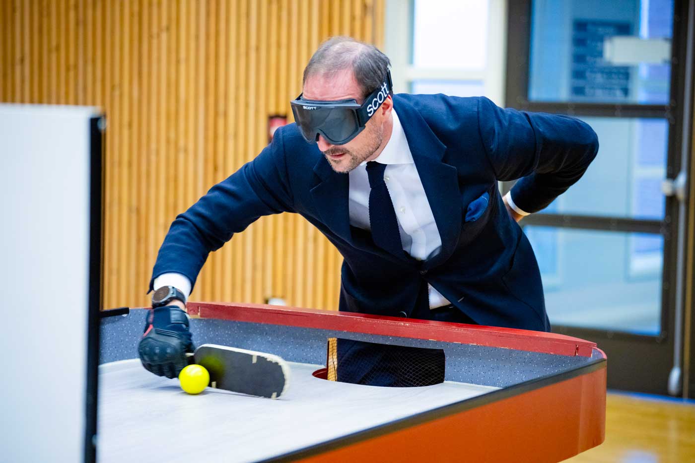 Le prince héritier Haakon, parrain de l’Association norvégienne des aveugles, a rencontré des responsables de l’organisme et des bénéficiaires du centre. Lors de sa visite, plusieurs cours et ateliers étaient donnés. Le prince héritier Haakon a pu participer à plusieurs d’entre eux. Haakon a notamment découvert le showdown, un sport qui connaît une croissance de popularité en ce moment, au point de vouloir l’inscrire aux Jeux paralympiques. Il s’agit d’un mélange entre le tennis de table et le hockey.