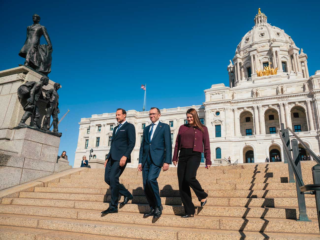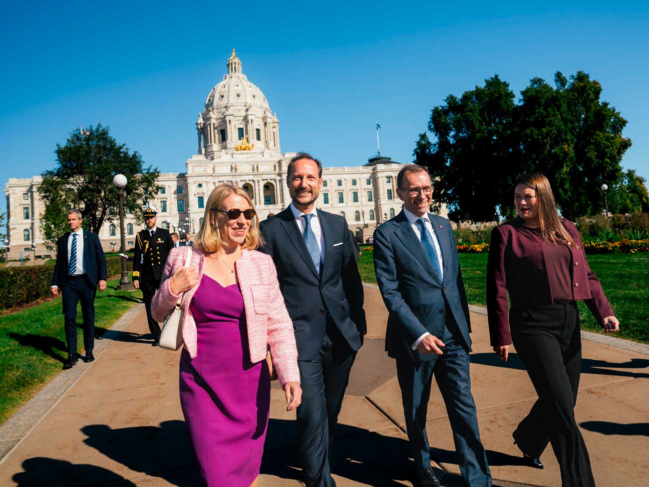 Le gouverneur du Minnesota, Tim Walz, a accueilli le fils du roi Harald V au Capitole d’État à Saint Paul. Saint Paul est la capitale de l’État mais Minneapolis est la plus grande ville. Les deux villes sont d’ailleurs voisines et forment ensemble une zone urbaine importante. Lors de cette visite au Capitole d’État, le prince héritier et le gouverneur ont discuté des liens étroits entre la Norvège et le Minnesota, ainsi que sur les priorités et initiatives en matière de défense et d’économie.