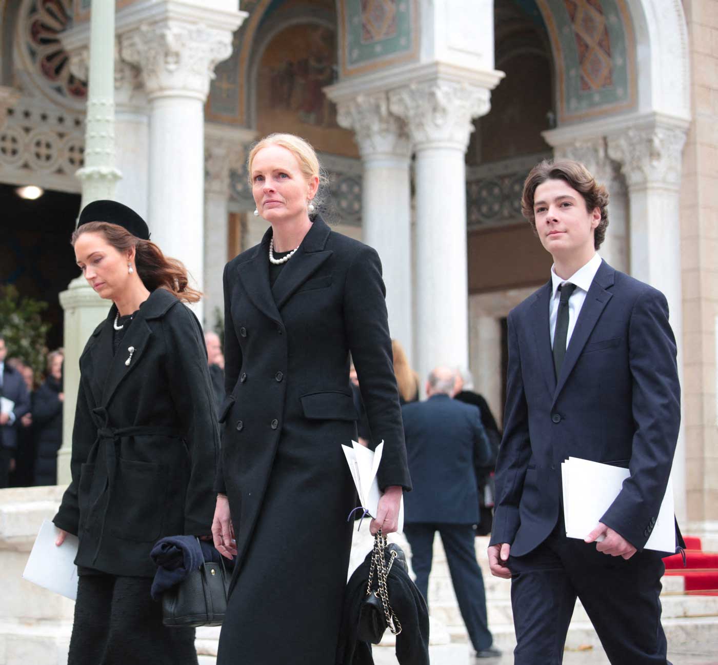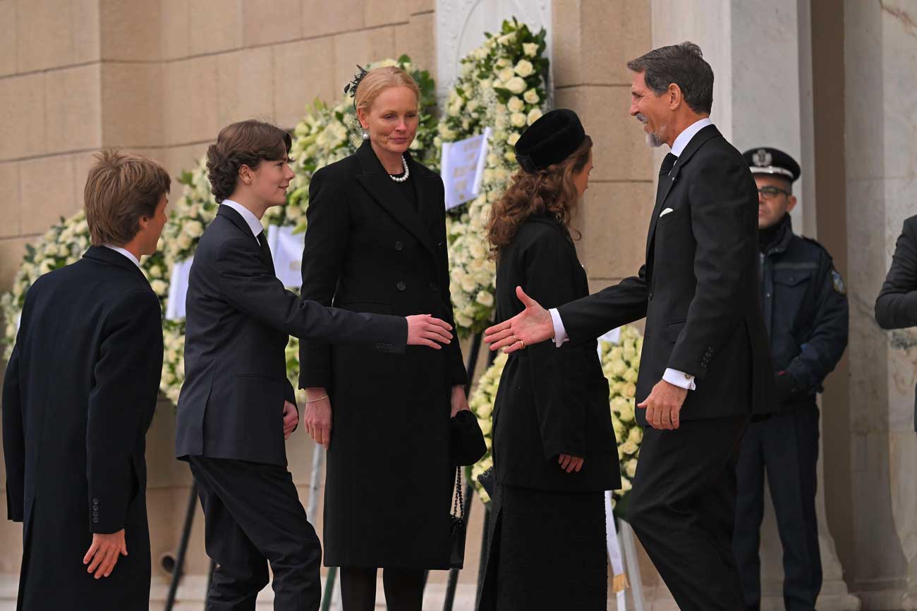 La famille royale grecque était elle aussi réunie en nombre autour de la reine Anne-Marie, veuve du roi Constantin II, et du prince héritier Pavlos, chef de la famille royale grecque depuis la mort de son père en 2023. Le prince héritier Pavlos était entouré de ses frères et sœurs et de trois de ses cinq enfants. Parmi les représentants de familles royales étrangères se trouvaient le prince héritier Alexander de Serbie, la princesse Sofia de Roumanie, le prince Christian de Hanovre, la princesse Sophie-Alexandra de Bavière, la duchesse Elisabeth en Bavière et le prince Siméon de Bulgarie.