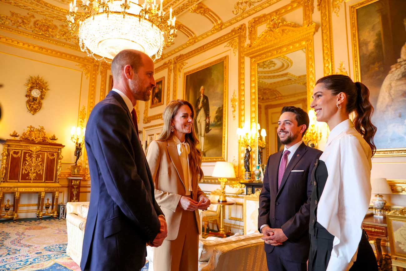 C’est au château de Windsor que le prince héritier Hussein et la princesse Rajwa ont été accueillis officiellement par leurs homologues britanniques. Le prince et la princesse de Galles, rentrés de leur visite en Irlande du Nord, ont ouvert les portes du château à leurs invités jordaniens. Les deux couples héritiers sont souvent comparés dans la presse. Hussein et Rajwa sont considérés comme les « William et Kate » du Moyen-Orient, en raison de la touche glamour qu’apporte Rajwa depuis son mariage.