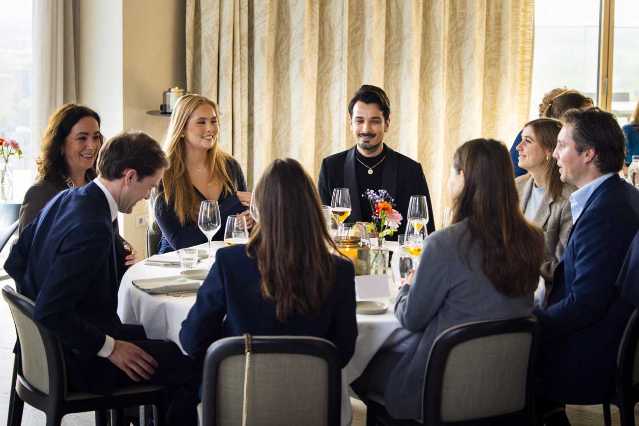 Ce vendredi, la journée a commencé par un déjeuner de travail. Ce type d’engagement est fréquent mais la princesse Amalia était ici confrontée à un nouvel exercice. Durant le déjeuner, la fille aînée du roi Willem-Alexander et de la reine Máxima a échangé avec de jeunes avocats, banquiers et consultants. La princesse Amalia a interrogé ces jeunes de sa génération à propos de leurs ambitions et de la façon dont ils géraient leur charge de travail. Ils ont aussi abordé la situation géopolitique actuelle et la façon dont elle influence leur domaine d’activité.