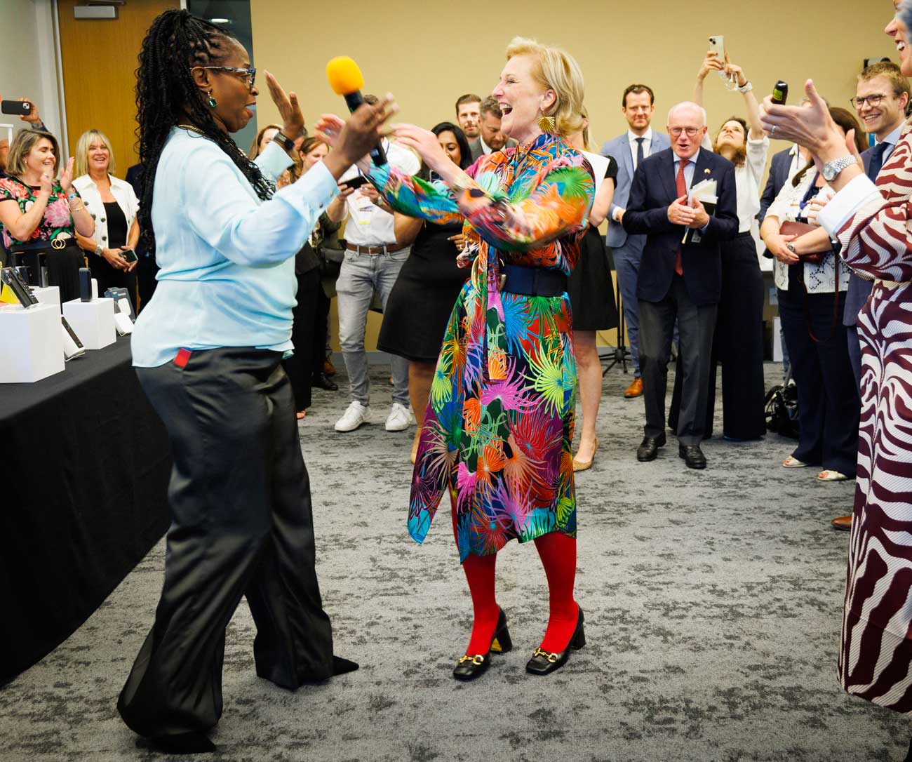Durant cette visite au Lab126, installé à Sunnyvale, la princesse Astrid s’est montrée très décontractée, en dansant avec le personnel du laboratoire de recherche. Pour cette visite, comme les visites précédentes, y compris celles de la veille, la princesse Astrid portait une tenue colorée signée Katerin Theys, une créatrice belge installée à Hong Kong.