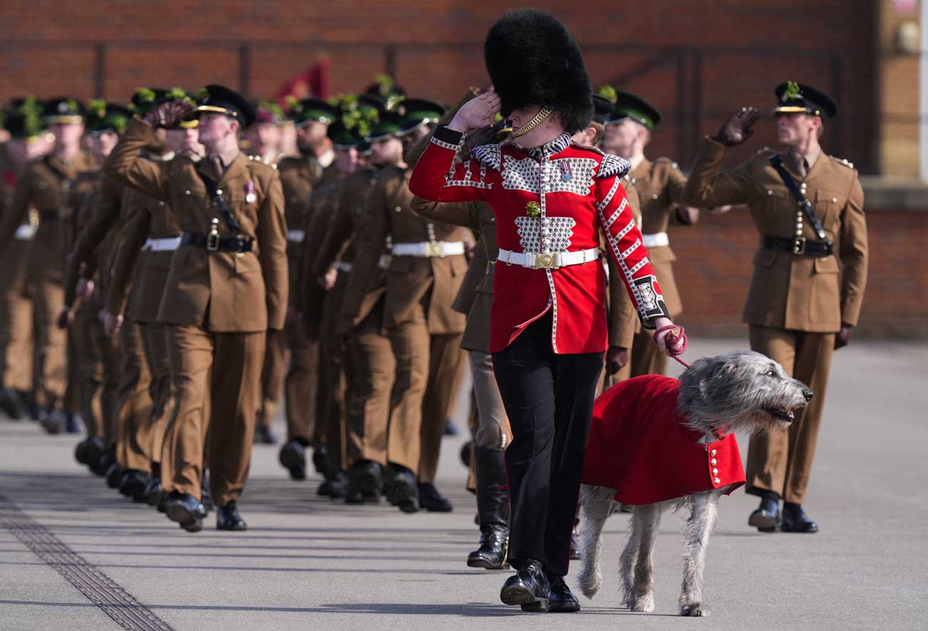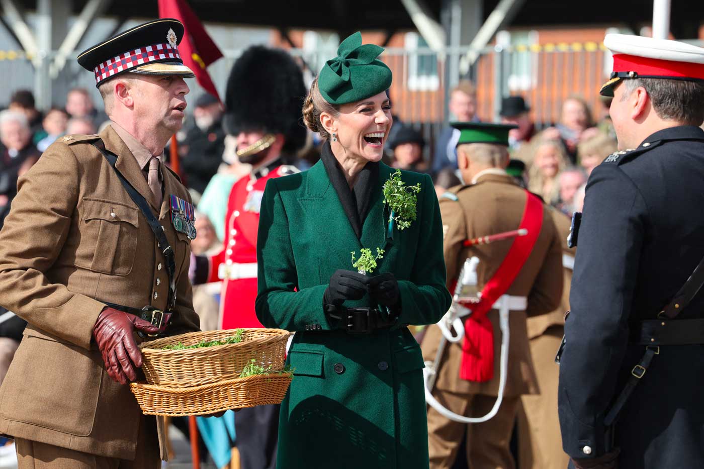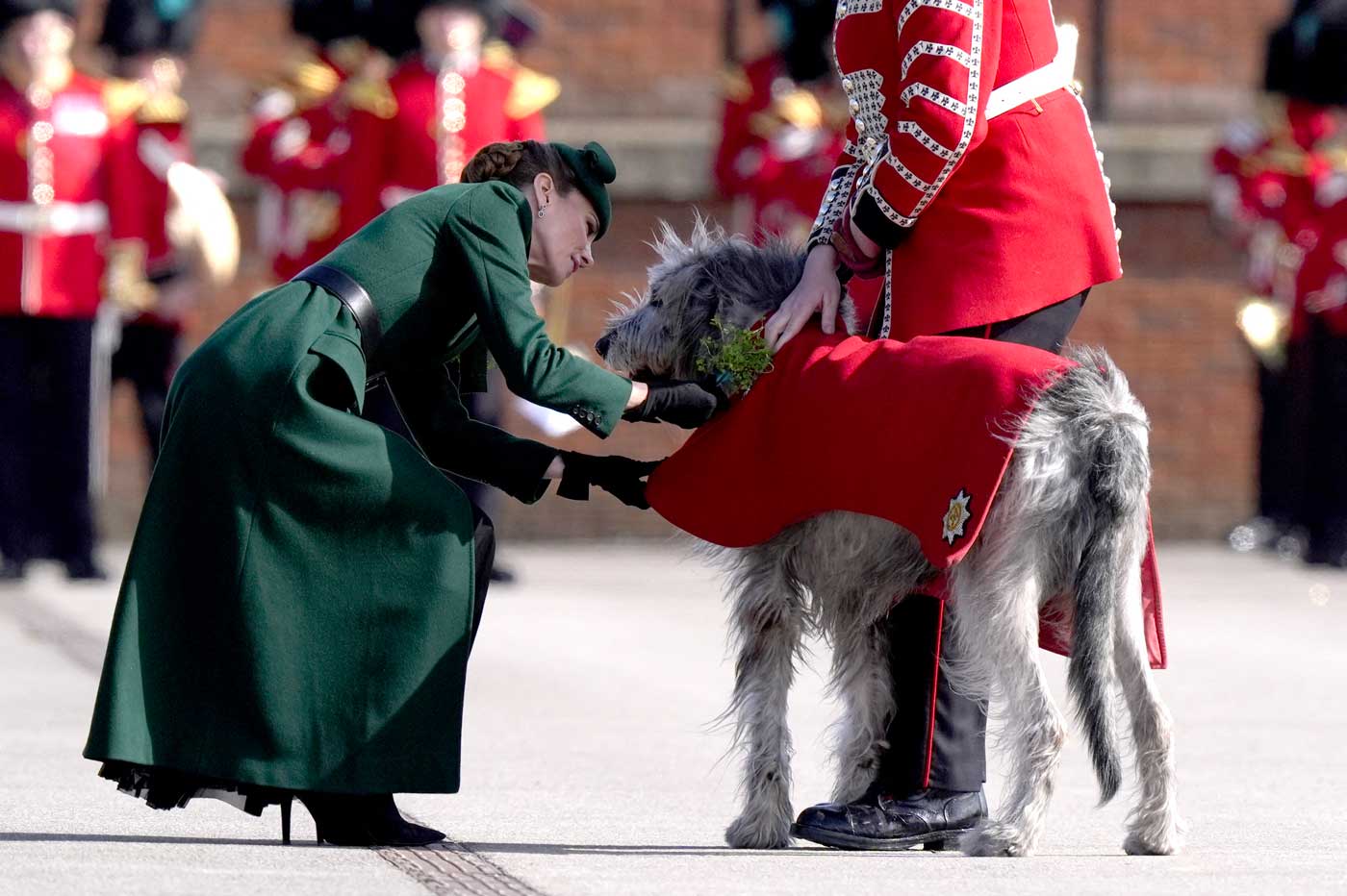 Chaque année, des membres de la famille royale participent à des événements militaires pour la Saint-Patrick. Depuis qu’elle endosse le rôle de colonelle du régiment des Gardes irlandais, c’est la princesse de Galles qui est chargée d’assister à la parade militaire et de distribuer des trèfles, y compris au lévrier irlandais Turlough Mór, mascotte du régiment.