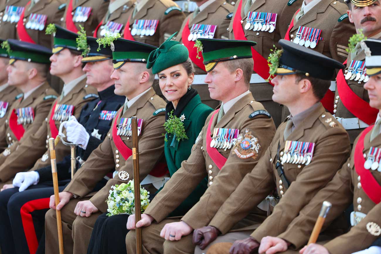 À l’occasion de la Saint-Patrick, la colonelle du régime des Gardes irlandais assiste à une parade militaire et distribue des bouquets de trèfles que les invités épinglent à la poitrine. La princesse Catherine, 44 ans, qui portait bien évidemment un long manteau vert, a également offert un bouquet de shamrocks à Turlough Mór, le lévrier irlandais qui est la mascotte du régiment.