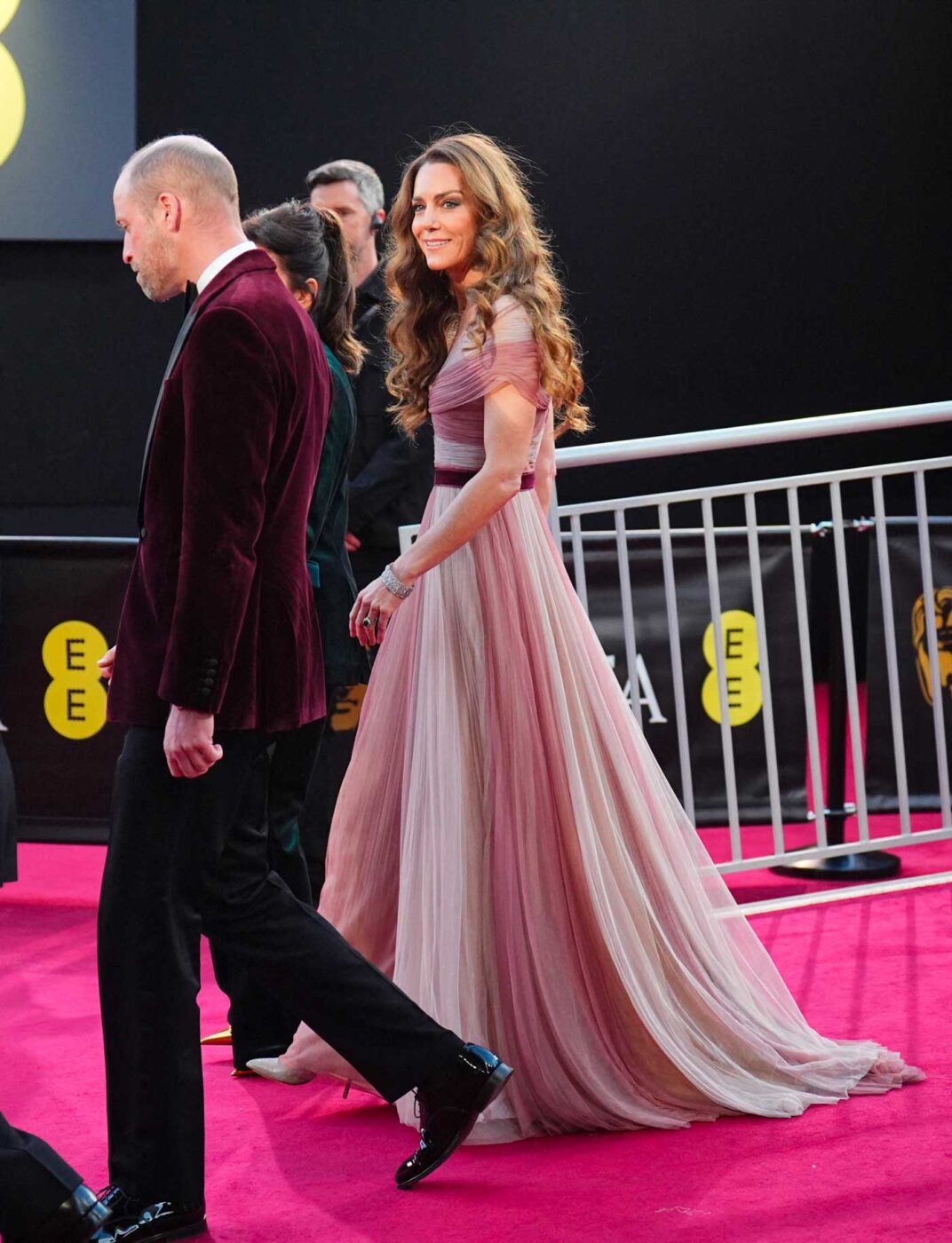La princesse de Galles avait assisté pour la dernière fois à la cérémonie de remise des BAFTA en 2023, en raison de son cancer. Sa présence était donc très attendue cette année et Kate a ravi ses fans en choisissant une somptueuse robe Gucci dans les tons roses et violacés. La couleur de la robe était assortie au smoking bordeaux du prince William et le rose n’était pas choisi au hasard. Pour cette 79e édition des BAFTA, la tapis rouge était de couleur rose.