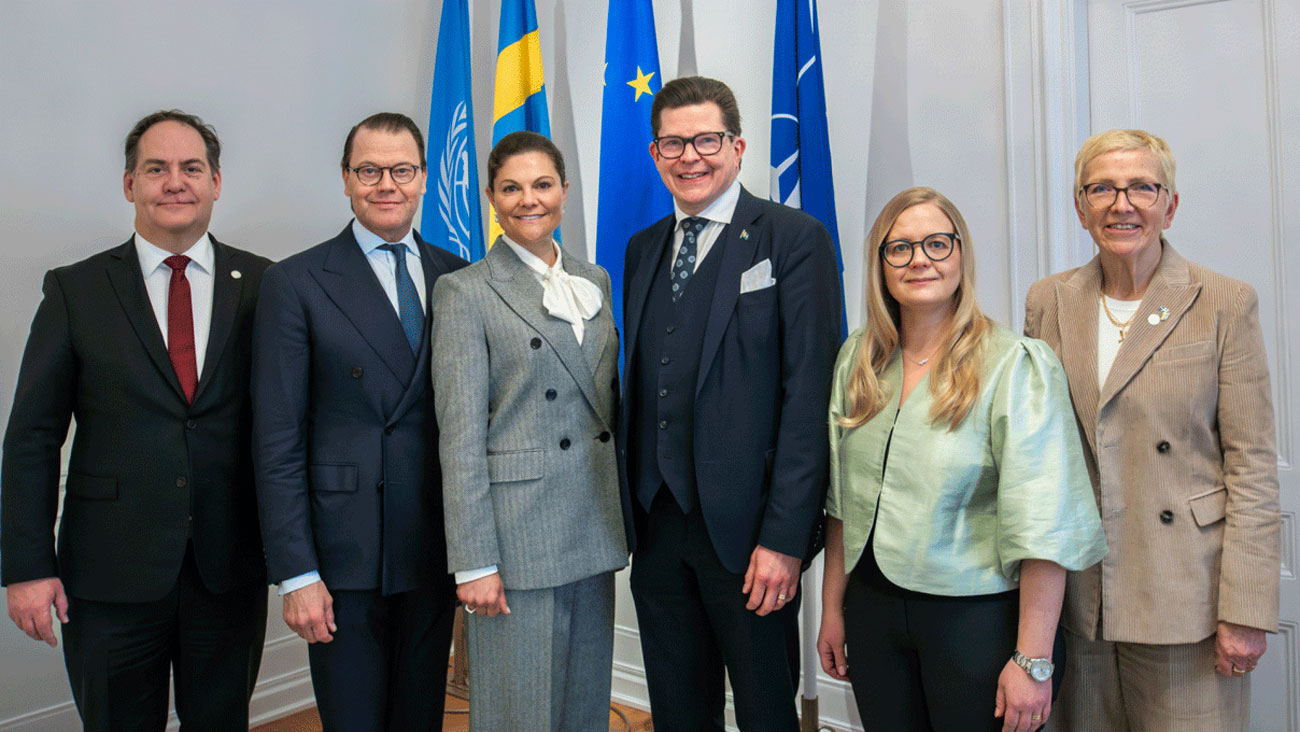 Le couple princier héritier avec le bureau du président du Riksdag, de gauche à droite : le premier vice-président Kenneth G. Forslund, le président Andreas Norlén, la deuxième vice-présidente Julia Kronlid et la troisième vice-présidente Kerstin Lundgren (Photo : Linnea Bengtsson/Sveriges riksdag)