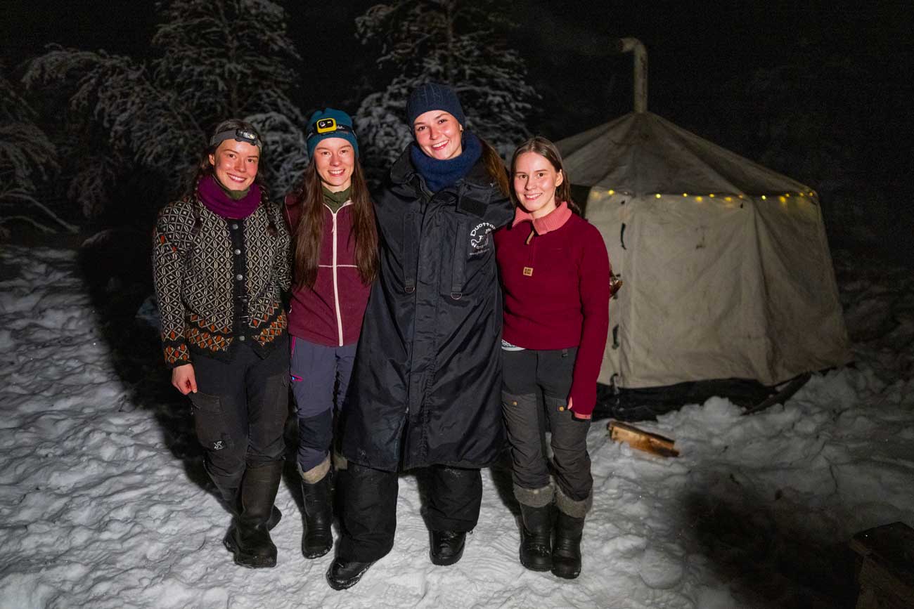 La princesse Ingrid Alexandra, Inga Julie Johnsdatter, Grethe Marit Johnsdatter et Karen Elen Anne devant une hute traditionnelle (Photo : NTB/ Dana Press)