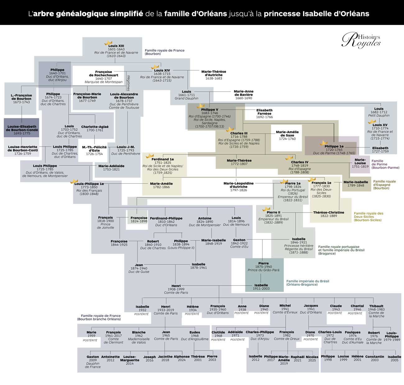 Arbre généalogique simplifié de la famille d’Orléans, depuis Louis XIII et Louis XIV, jusqu’à la princesse Isabelle, fille du prince Charles-Louis (Image : Histoires Royales)
