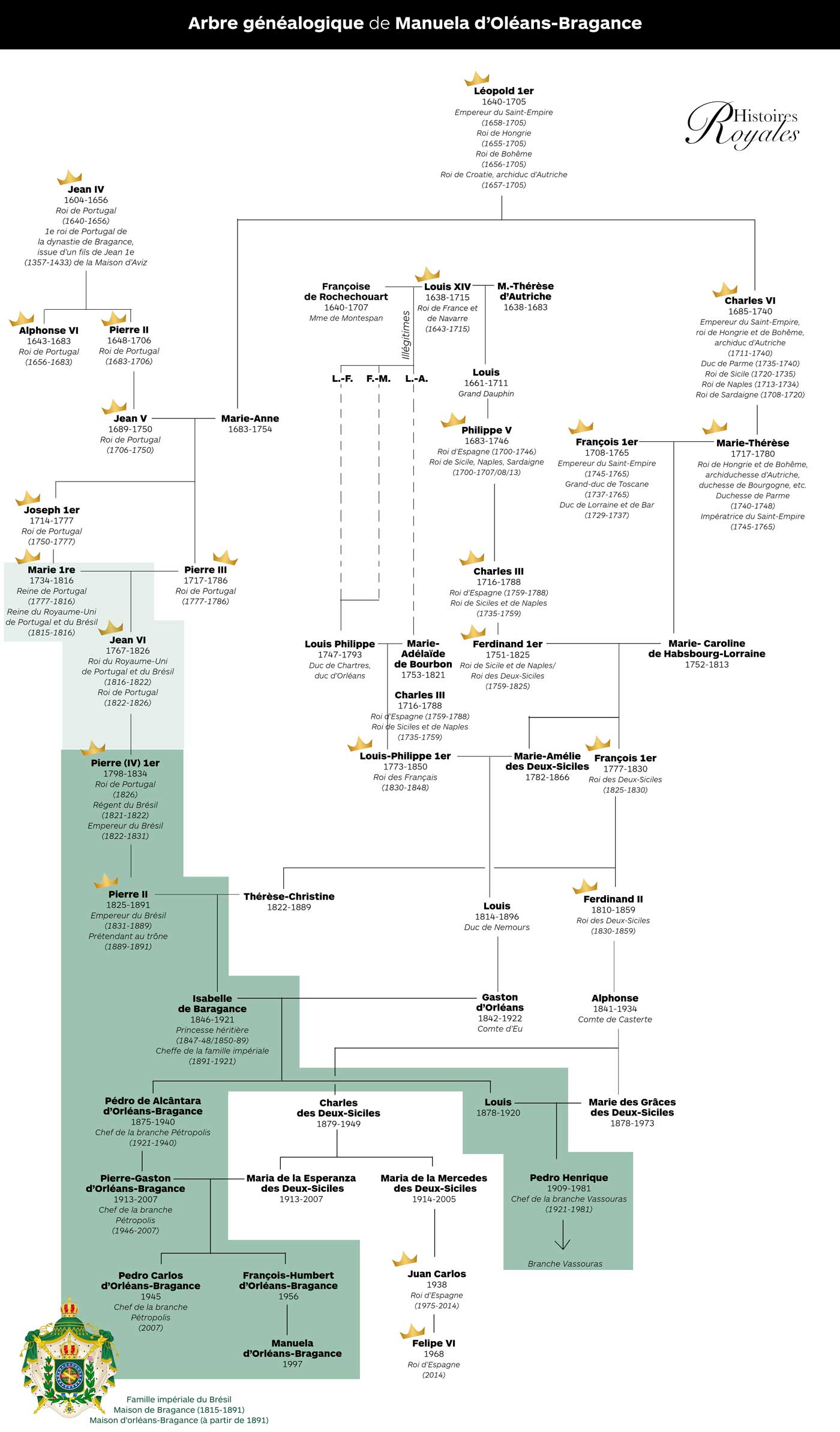 La princesse Manuela est la fille du prince François-Humbert et de sa seconde épouse, Rita de Cássia Pires. Le prince François-Humbert est le frère du prince Pedro Carlos, l’actuel chef de la branche Pétropolis de la famille impériale du Brésil. Deux branches descendantes de la régente Isabelle du Brésil s’opposent d’un point de vue dynastique. Outre ses ascendances royales et impériales (elle descend du roi Louis XIV, des rois du Portugal ou encore des empereurs du Saint-Empire), Manuel a un cousinage royal important avec l’Espagne. Sa grand-mère, la princesse Maria de la Esperanza des Deux-Siciles était la tante maternelle du roi Juan Carlos. Autrement dit, le prince François-Humbert est un cousin germain du roi Juan Carlos d’Espagne.