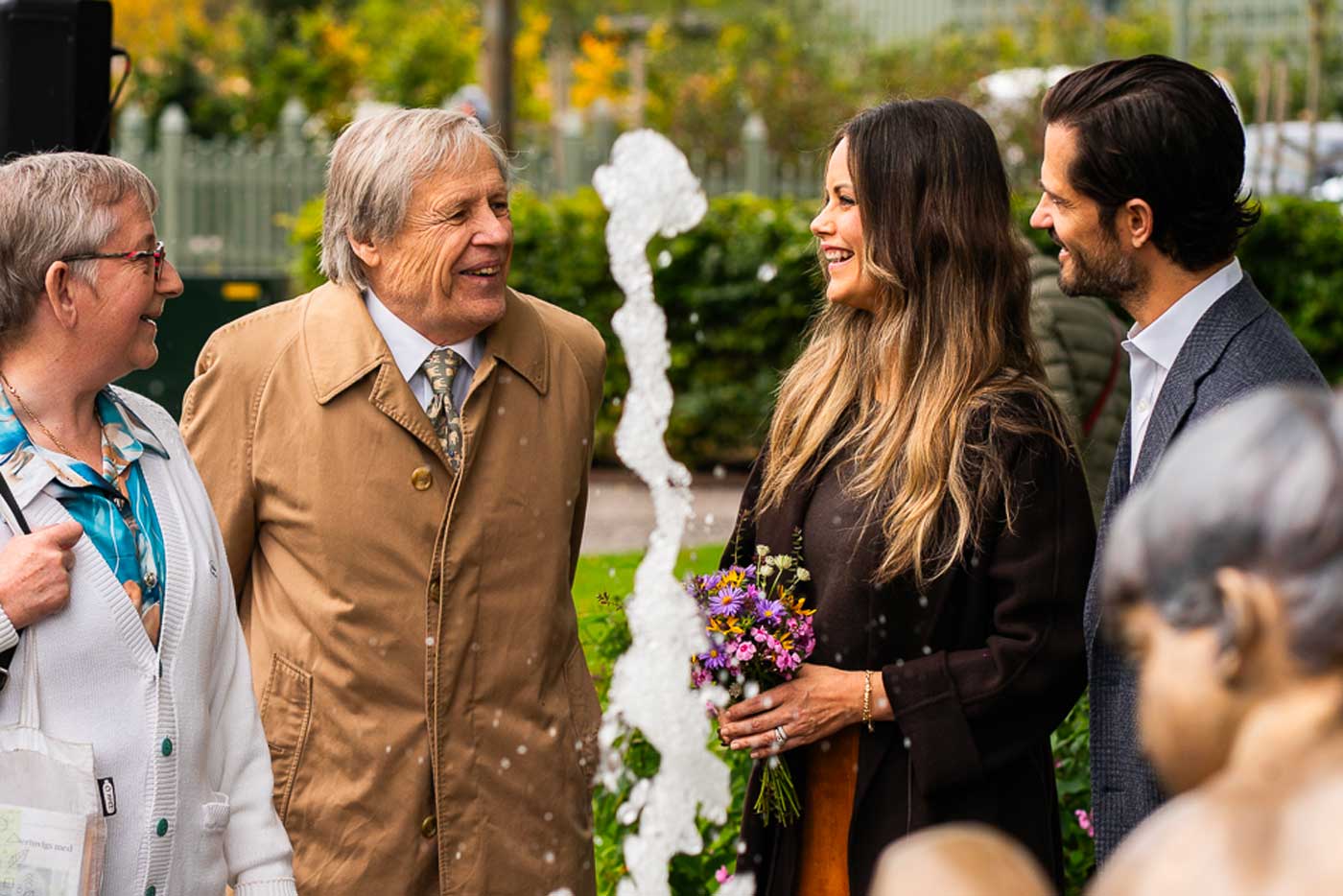 Le fils et la belle-fille du roi Carl XVI Gustaf discutent avec l’artiste Peter Linde qui a réalisé la fontaine (Photo : Sara Friberg/Kungl. Hovstaterna)