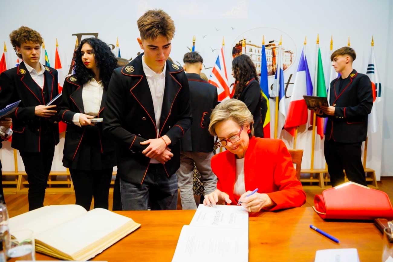 Le mercredi 19 novembre, la princesse Sofia a visité le Collège national « Costache Negruzzi ». Cet établissement scolaire fête son 130e anniversaire. La visite a débuté par une présentation des locaux et des espaces pédagogiques, guidée par la directrice, la professeure Camelia Gavrilă. La princesse Sofia a ensuite assisté à une présentation retraçant l’histoire de la famille royale roumaine et les liens de l’établissement avec la Couronne de Roumanie. Dans l’amphithéâtre du collège, un dialogue s’est instauré avec les élèves et les enseignants, qui ont présenté leurs projets pédagogiques, leurs activités de recherche et leurs initiatives culturelles.