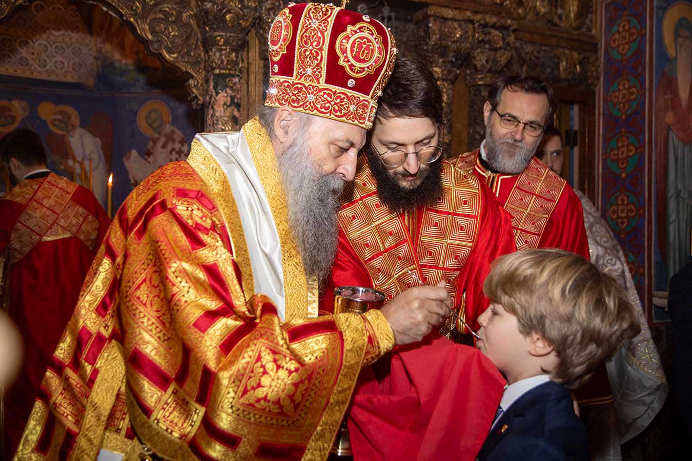 Le patriarche Porphyre de Serbie a présidé la sainte liturgie à la chapelle royale dédiée à saint André, assisté du révérend archimandrite Gerasim de Hilandar et des prêtres de l’archidiocèse de Belgrade. Le jeune prince Stefan a fait forte impression en récitant le Notre Père durant l’office, comme c’est dorénavant devenu une tradition. Après la liturgie, la découpe solennelle du gâteau Slava, pain traditionnel préparé pour la fête du saint patron, a également été célébrée au salon Bleu du Palais royal par le patriarche.