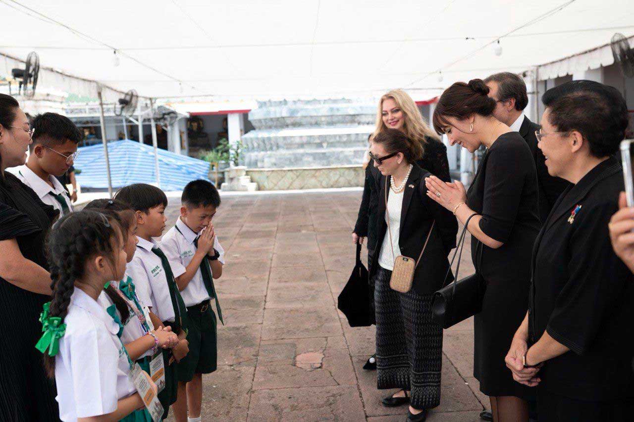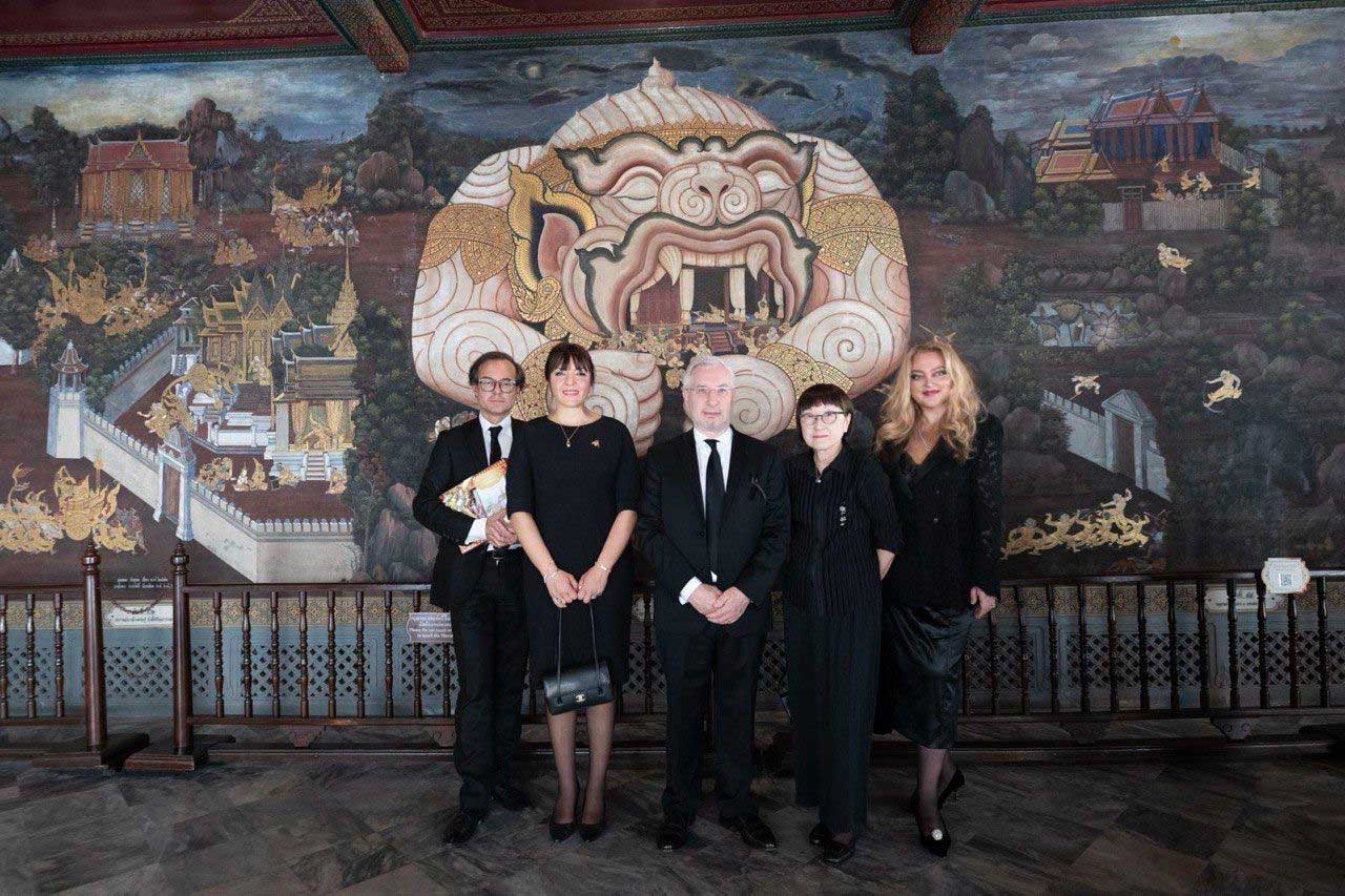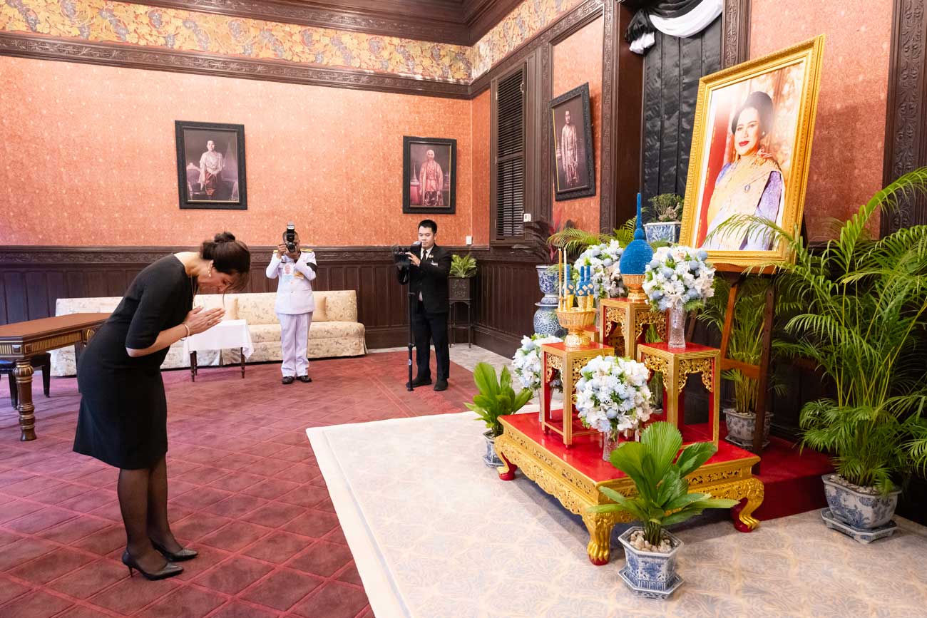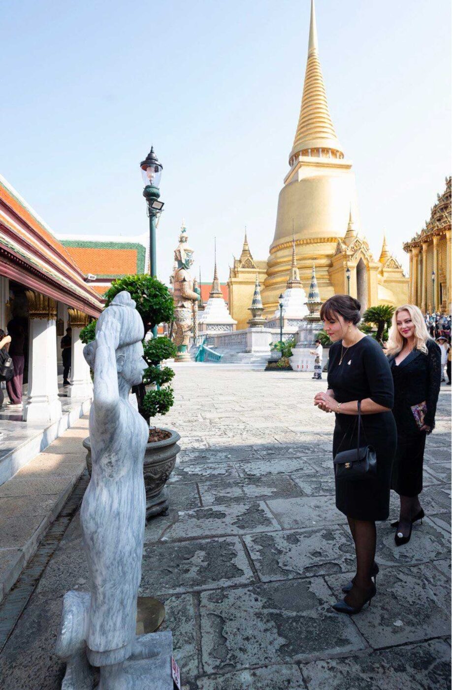 La visite se déroulait quelques mois après la disparition de la reine Sirikit, veuve du roi Bhumibol Adulyadej (Rama IX) et mère du roi Maha Vajiralongkorn (Rama X). La reine Sirikit est décédée à 93 ans en octobre dernier. Depuis lors, le deuil est toujours de rigueur dans l’enceinte du palais.