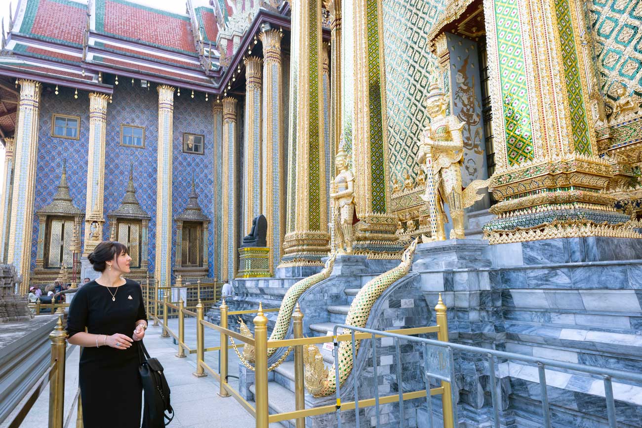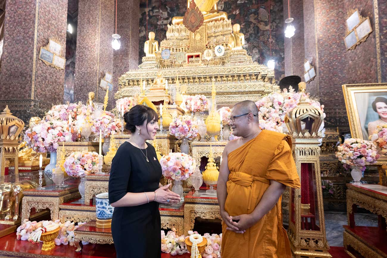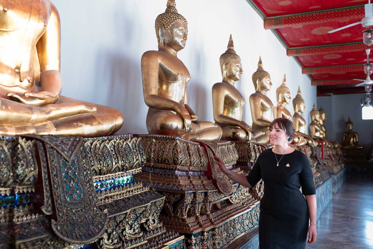 Avant de partir, la princesse Yasmine Murat a également visité le Wat Pho, un des plus anciens et des plus grands temples bouddhistes de Bangkok. Le temple jouxte le complexe du palais royal. On l’appelle aussi le Temple du Bouddha couché, en raison de sa statue de Bouddha sur son lit de mort qui mesure 46 mètres de long et 15 mètres de haut.