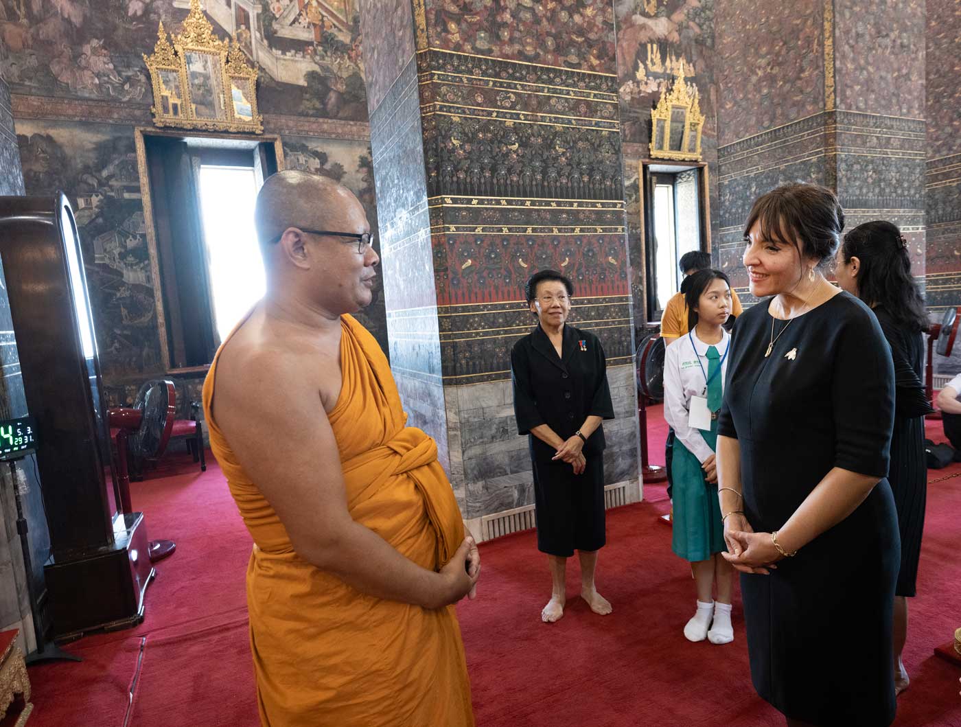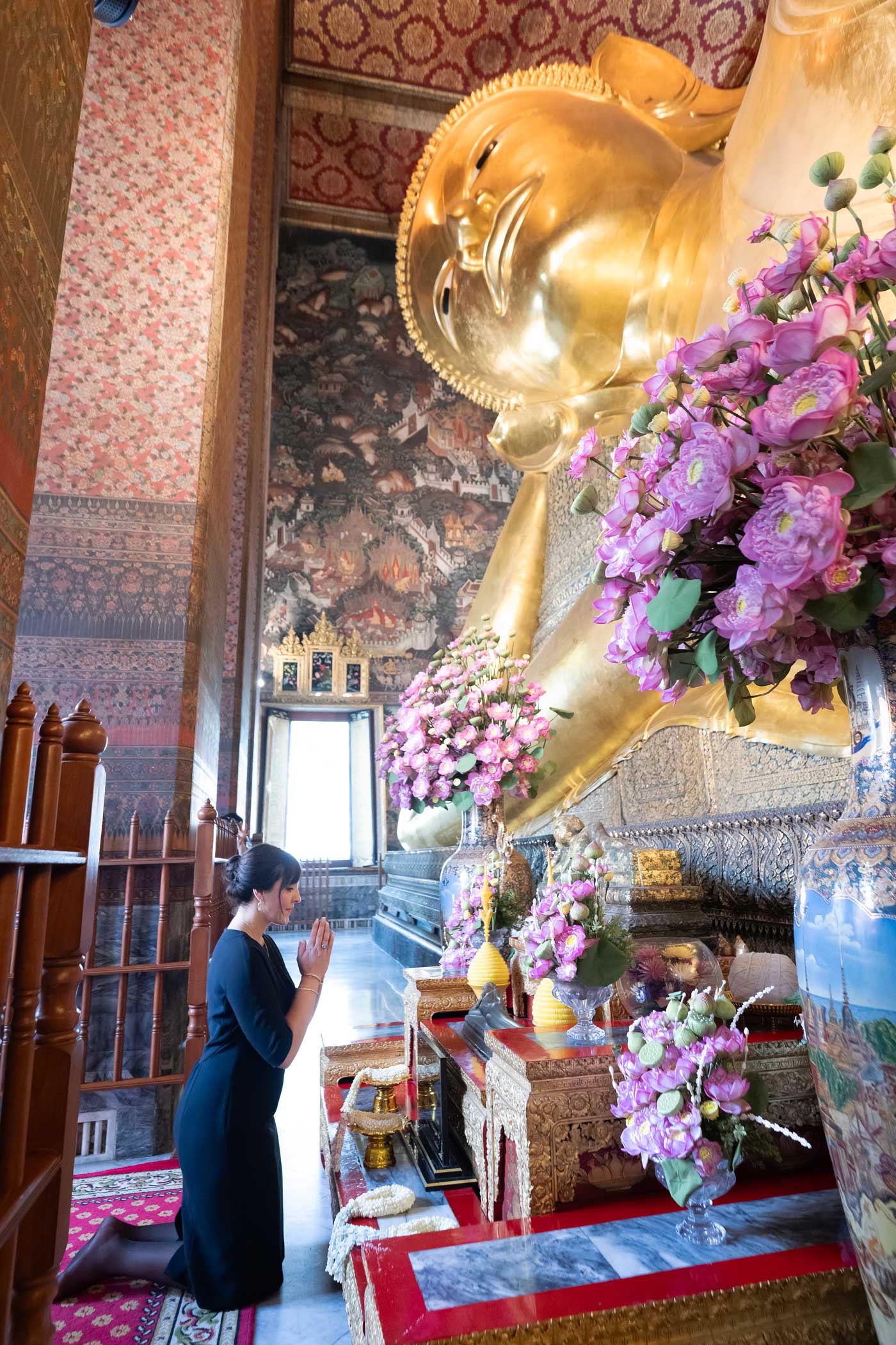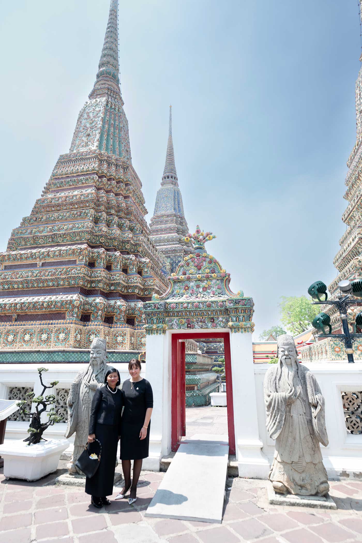 Avant de partir, la princesse Yasmine Murat a également visité le Wat Pho, un des plus anciens et des plus grands temples bouddhistes de Bangkok. Le temple jouxte le complexe du palais royal. On l’appelle aussi le Temple du Bouddha couché, en raison de sa statue de Bouddha sur son lit de mort qui mesure 46 mètres de long et 15 mètres de haut.