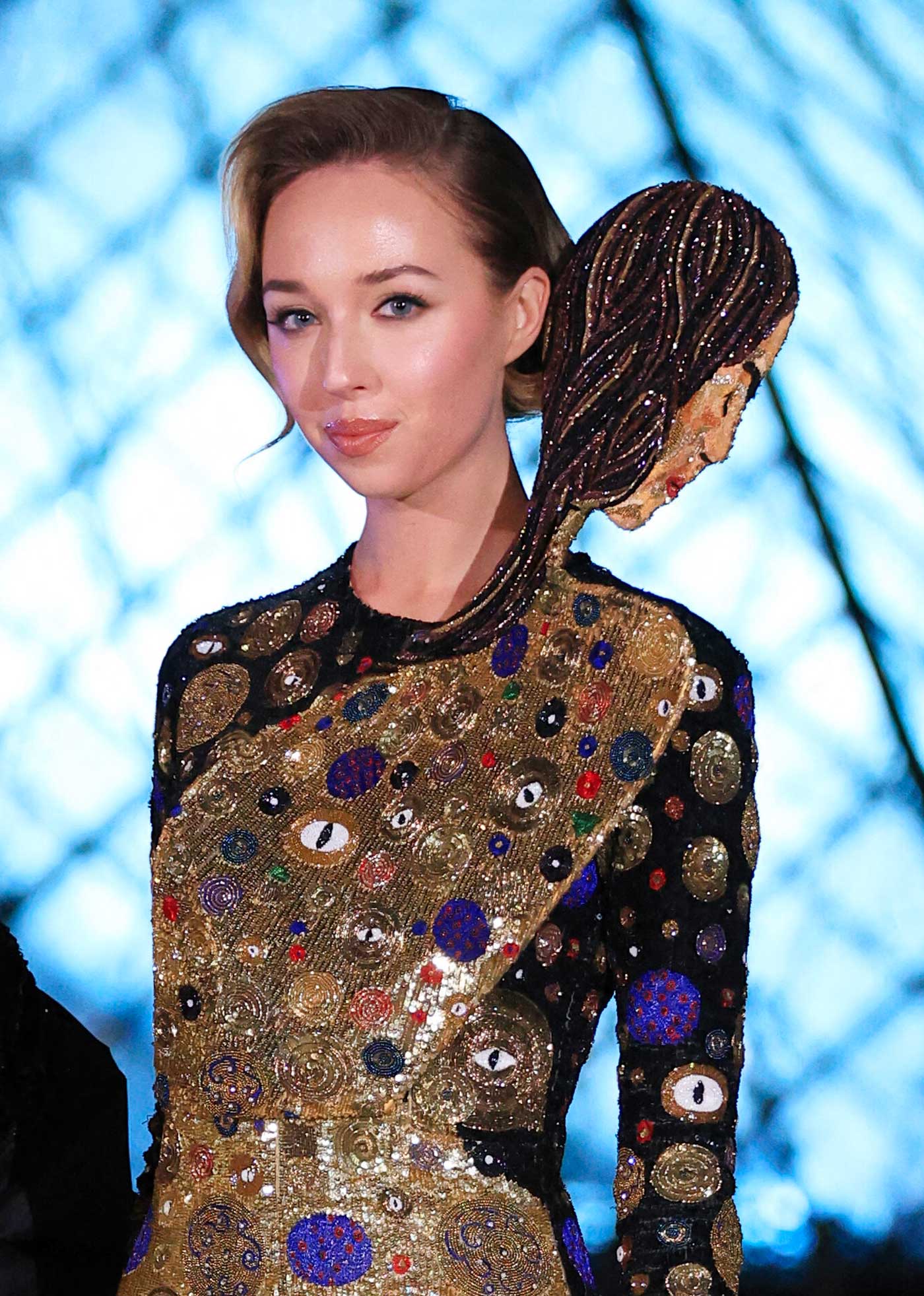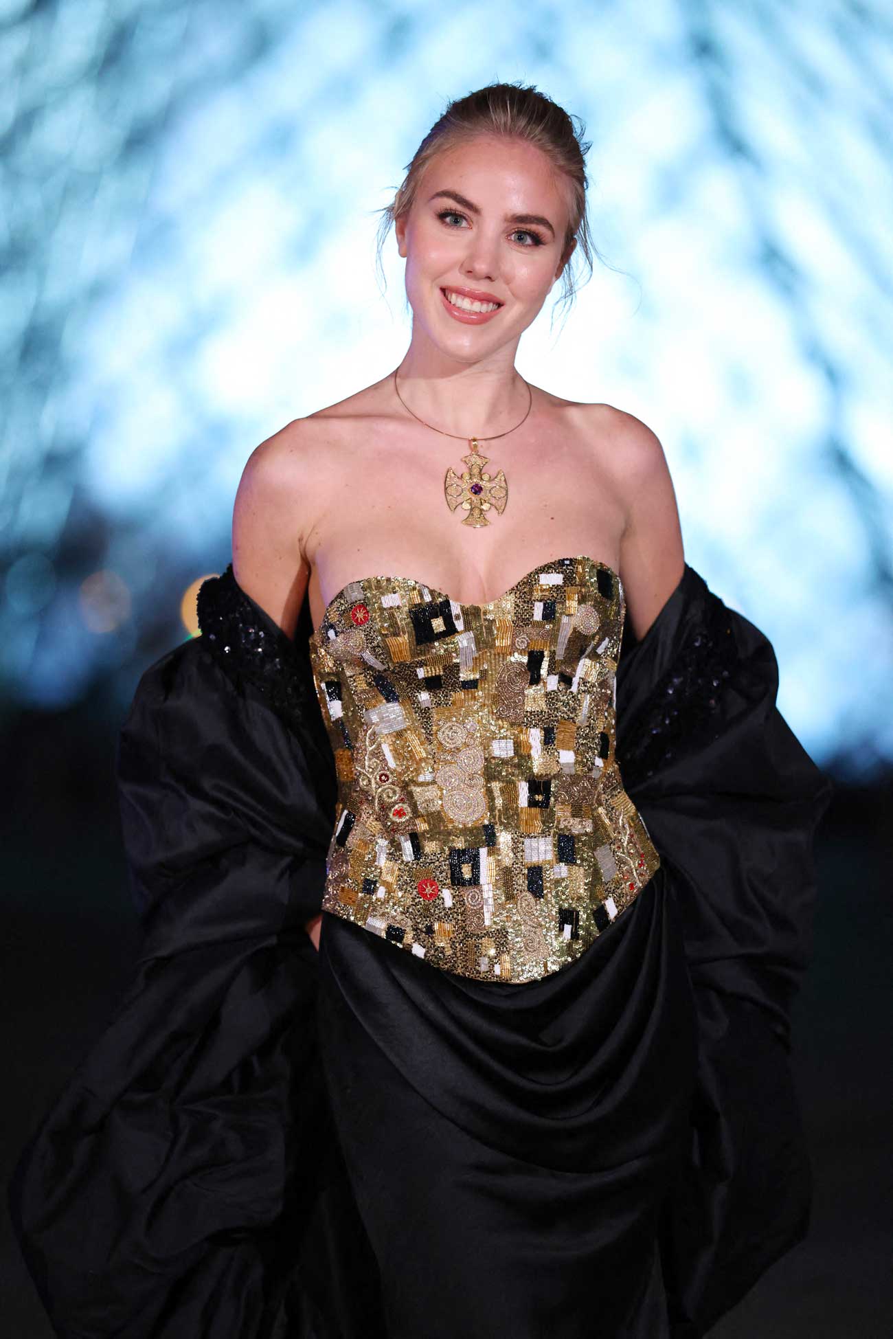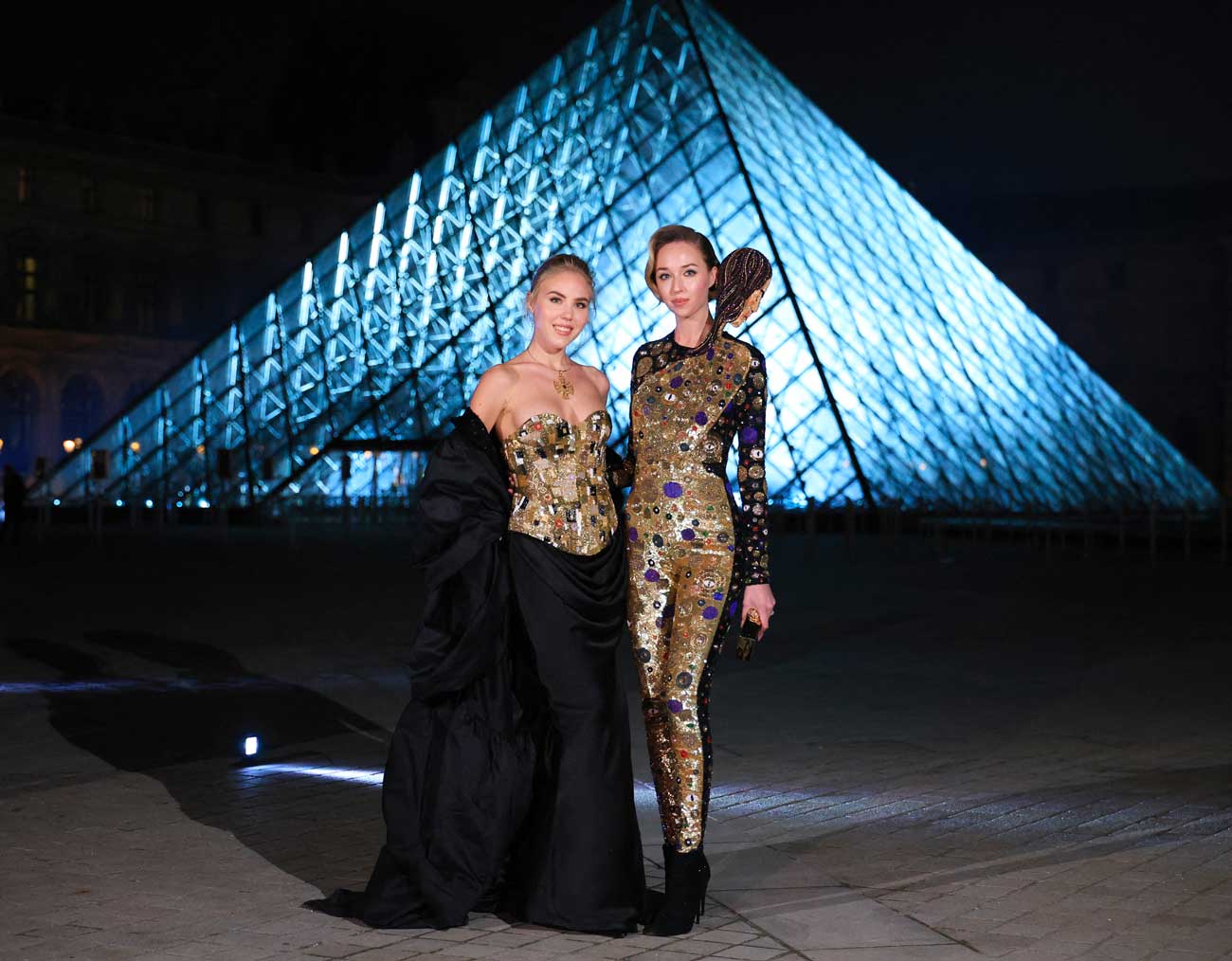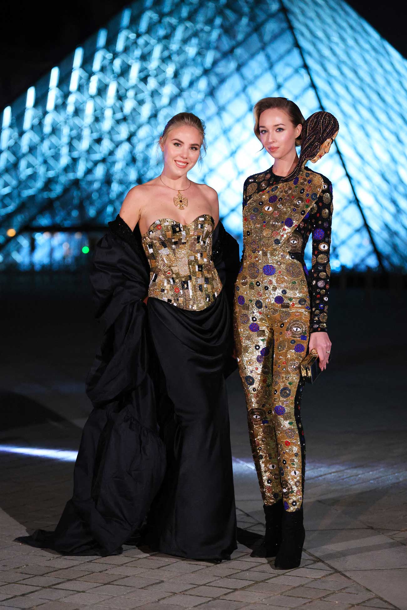 La princesse Maria-Carolina de Bourbon des Deux-Siciles, 22 ans, et sa sœur cadette, la princesse Maria Chiara, 21 ans, faisaient partie des personnalités dont l’arrivée n’est pas passée inaperçue. Dans leurs robes dorées et sculpturales, les descendantes des rois des Deux-Siciles et des rois de France ont pris la pose devant la célèbre pyramide de Ieoh Ming Pei.