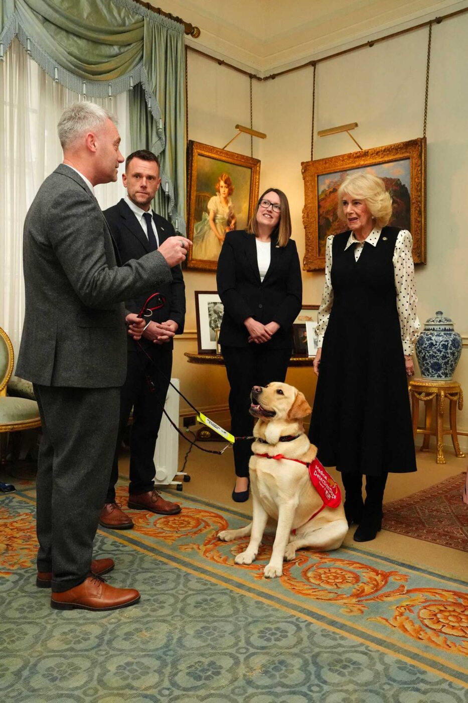 La reine Camilla a accueilli à son domicile des représentants de l’association Medical Detection Dogs, qui étaient accompagnés d’un de leurs chiens. Cet organisme entraîne les chiens à détecter différents types de maladies.