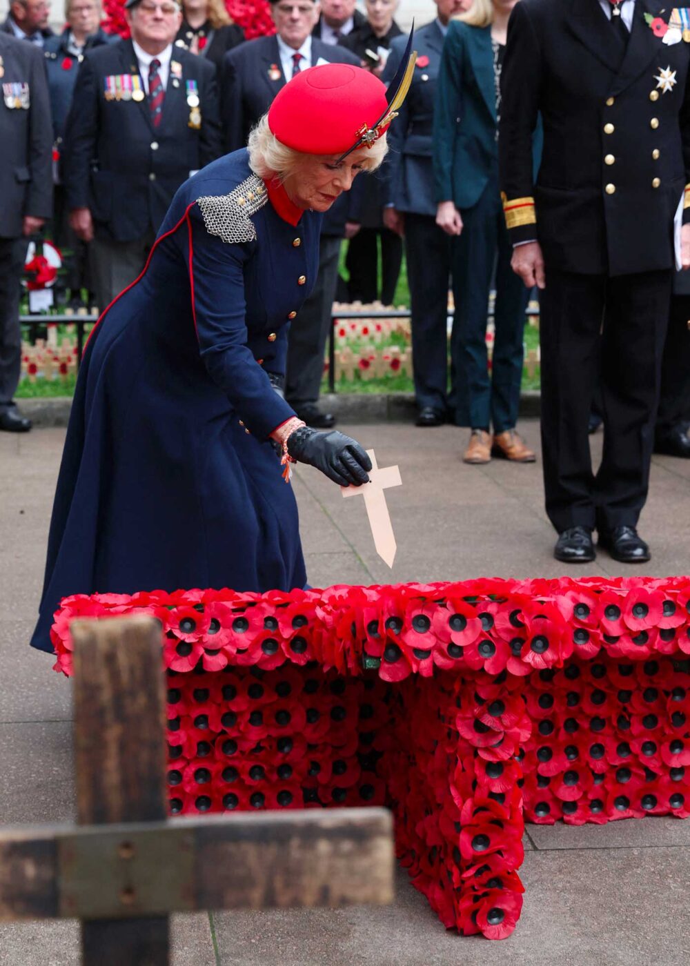La reine Camilla s’est recueillie devant le champ de coquelicots artificiels dans lequel sont plantées des croix en bois. Les croix sont vendues pour la bonne cause puis plantées en mémoire de ceux qui ont perdu la vie pour la patrie. La reine Camilla elle aussi planté une croix en bois sur laquelle figure son monogramme.