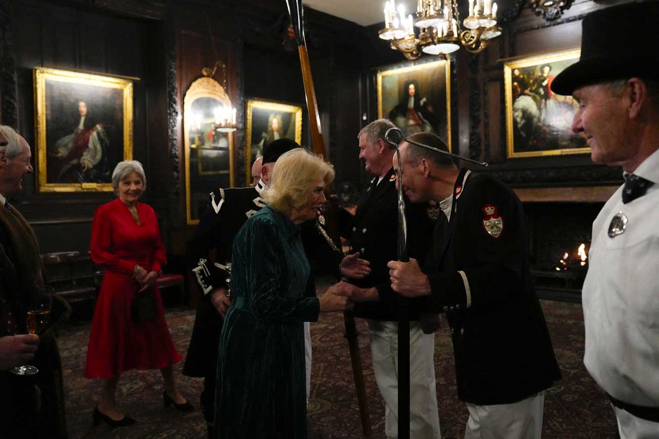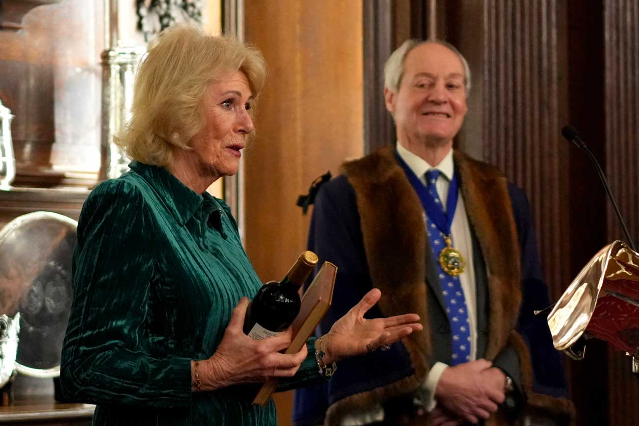 La reine Camilla a effectué une visite surprise au siège de la Vénérable corporation des négociants en vins. Son grand-père et son père travaillaient dans le commerce du vin et elle-même est membre de cette corporation ancestrale, qui jouit de privilèges royaux depuis le 14e siècle.