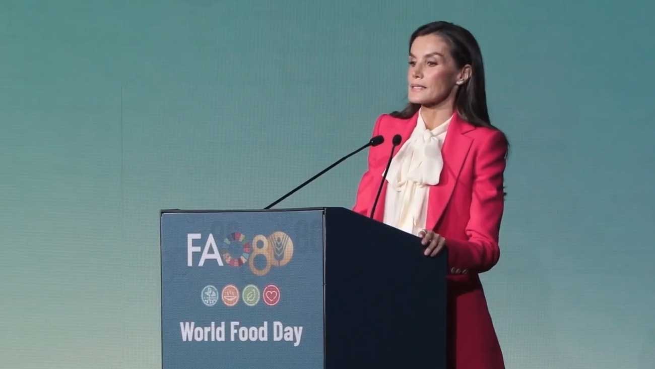 Ce 16 octobre, à l’occasion de la Journée mondiale de l’alimentation, la reine Letizia s’est rendue à Rome, où était organisé le 80e anniversaire de la FAO. De nombreux politiciens italiens et étrangers étaient conviés à cette cérémonie d’anniversaire, dont la première ministre Giorgia Meloni, le vice-premier ministre italien Antonio Tajani, le roi Letsie III du Lesotho, le président uruguayen Yamandú Orsi, la princesse Basma de Jordanie, et l’ancien secrétaire général des Nations unies Ban Ki-moon.