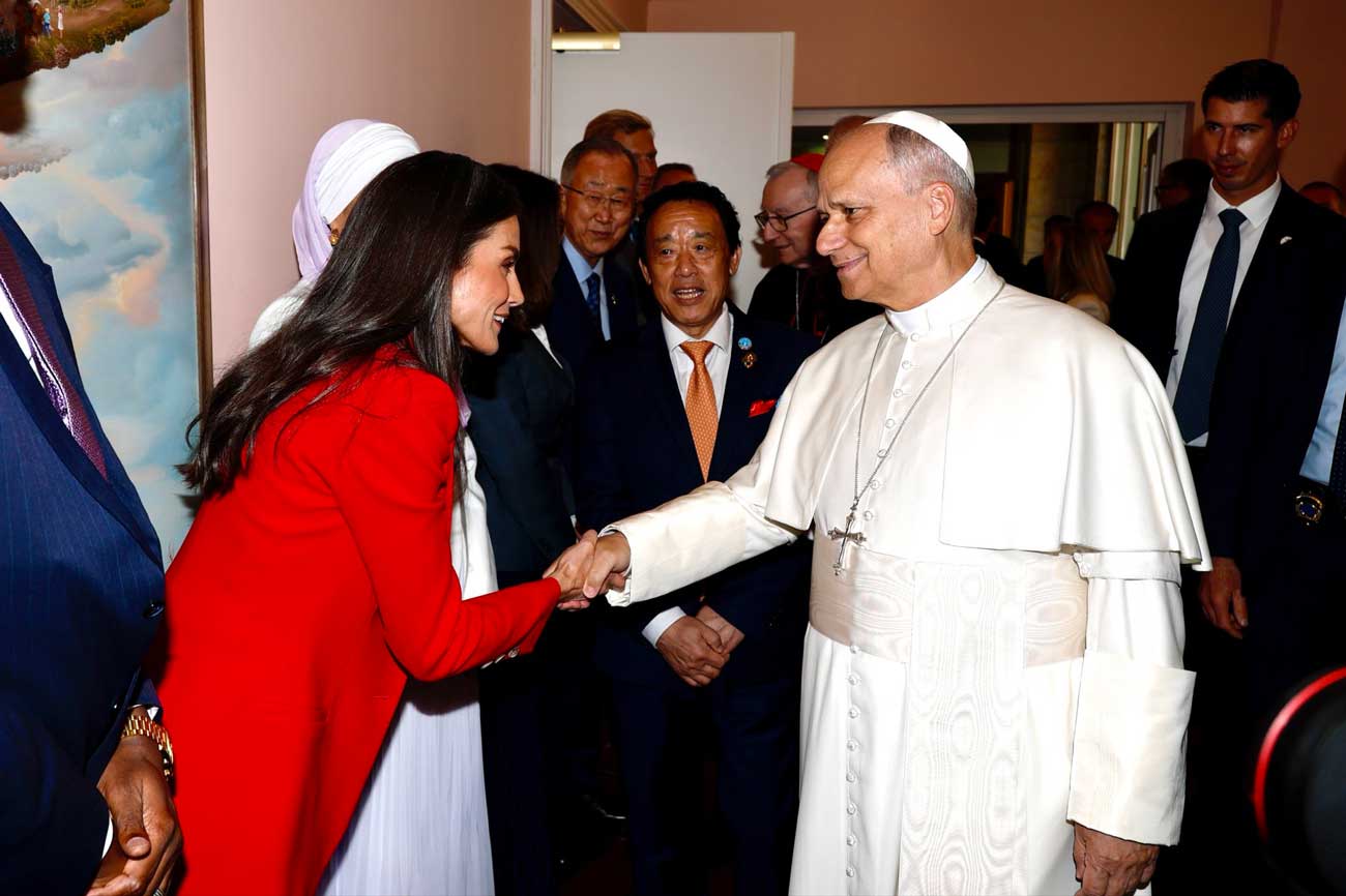 Au cours de la cérémonie, plusieurs invités ont pris la parole, y compris le pape Léon XIV, qui assistait à l’événement. Avant la cérémonie, la reine Letizia a pu rencontrer le souverain pontife. Le roi Felipe VI et la reine Letizia avaient assisté à la cérémonie d’installation du pape Léon XIV au mois de mai, usant alors de son privilège du blanc réservé aux souveraines catholiques.