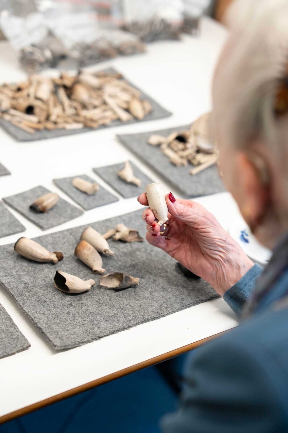 Lors de sa visite, la reine Margrethe a pu admirer plusieurs découvertes présentées par les archéologues. Les archéologues tamisent, rincent et trient minutieusement chaque jour les vestiges du passé caché de la ville Ces déchets, principalement des résidus d’objets ménagers, vont de bouts d’os à des pièces de monnaie, en passant par des morceaux de tissus, et divers fragments de métal. Certains fragments identifiables offrent un éclairage nouveau sur la vie quotidienne, l’artisanat et les conditions sociales dans ce quartier du centre-ville.