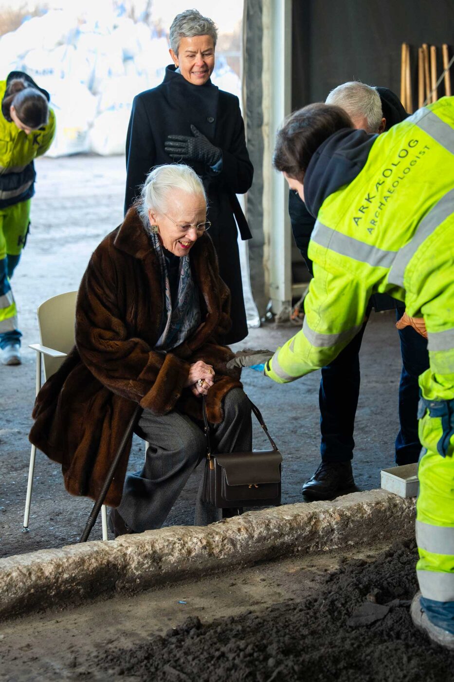 La responsable des fouilles, Karen Green Therkelsen, et Caroline Pontoppidan, chargée du projet de construction de Maersk, ont accueilli la mère du roi Frederik X sur le site où sont répertoriés les objets et les artéfacts trouvés. La terre est extraite depuis l’année dernière et transportée sur un autre site afin que la construction se poursuive dans le centre tout en continuant progressivement les recherches.