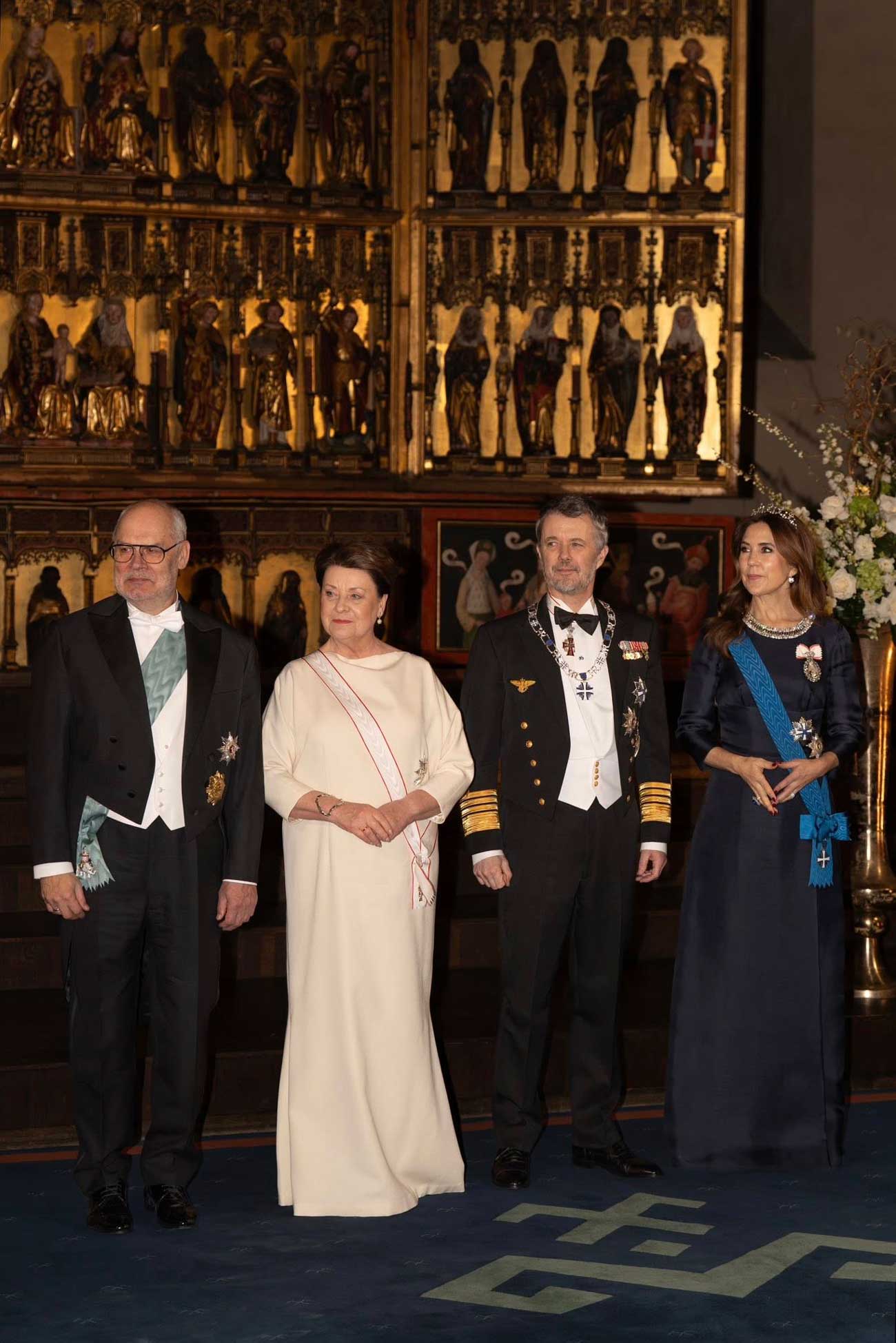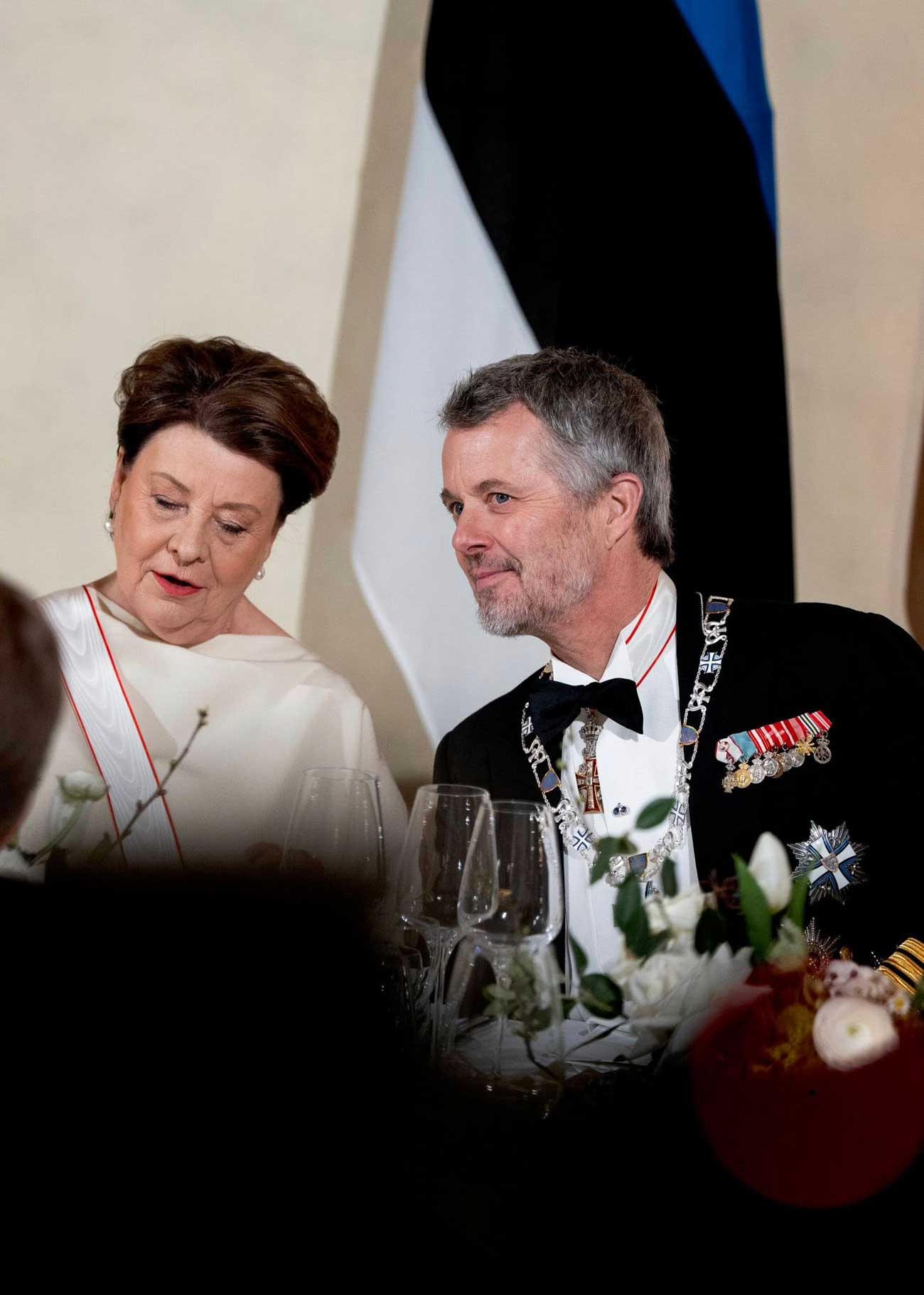 Pour assister au concert et au banquet, le roi Frederik X portait son collier de l’ordre de la Croix de Terra Mariana. Frederik avait déjà obtenu le grade de grand-croix par le passé mais il a reçu le collier de l’ordre en matinée, au cours d’une cérémonie d’échange de distinctions. En échange, le roi Frederik a remis le collier de l’ordre de l’Éléphant au président estonien, qui entre ainsi dans le cercle très restreint des chevaliers de cet ordre danois ancestral.