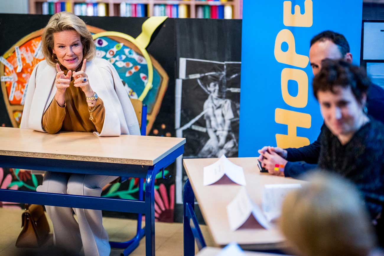 Ce 10 octobre 2025, la reine Mathilde, 53 ans, s’est rendue dans une école primaire du Groupe scolaire des Etangs n°5, à Ixelles, en région bruxelloise, afin de découvrir les mesures mises en place pour favoriser un climat d’apprentissage positif et serein. La visite avait aussi lieu en soutien de la deuxième édition de la campagne HOPE de la RTBF. L’acronyme HOPE signifie « Harcèlement, on s’y Oppose et on en Parle Ensemble ». Les quatre lettres de HOPE sont aussi quatre points d’engagement à suivre. La première étape est de prendre conscience du harcèlement, la deuxième étape est de s’opposer au harcèlement, troisièmement, il faut oser en parler et enfin, quatrièmement, il faut y faire face tous ensemble.