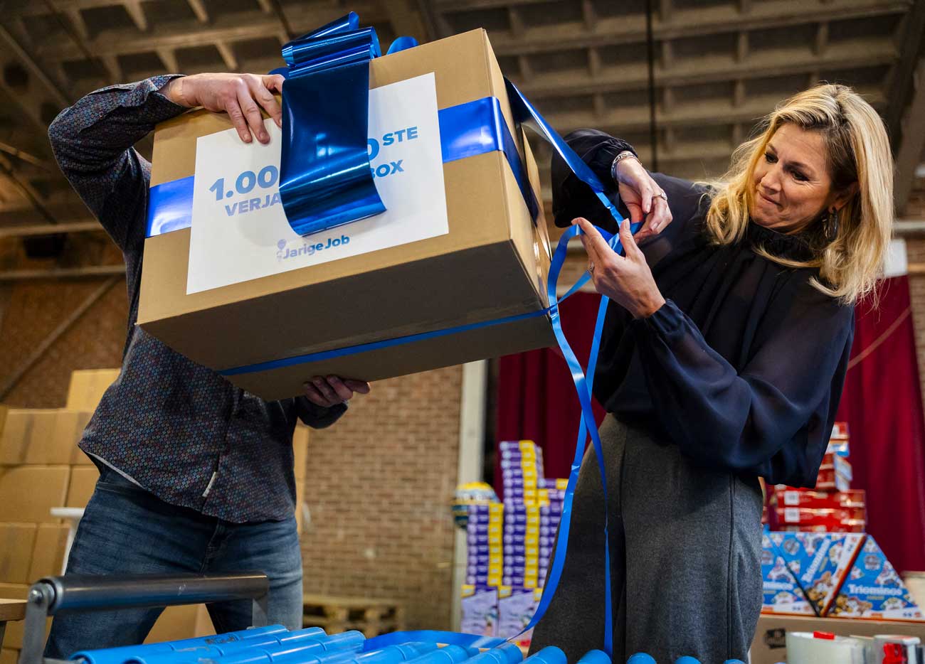 La reine Máxima a visité l’entrepôt de l’association Jarige Job, ce jeudi. La reine des Pays-Bas a emballé un paquet un peu spécial. Il s’agissait du millionième cadeau que l’association offrira à un enfant dans le besoin, à l’occasion de son anniversaire.