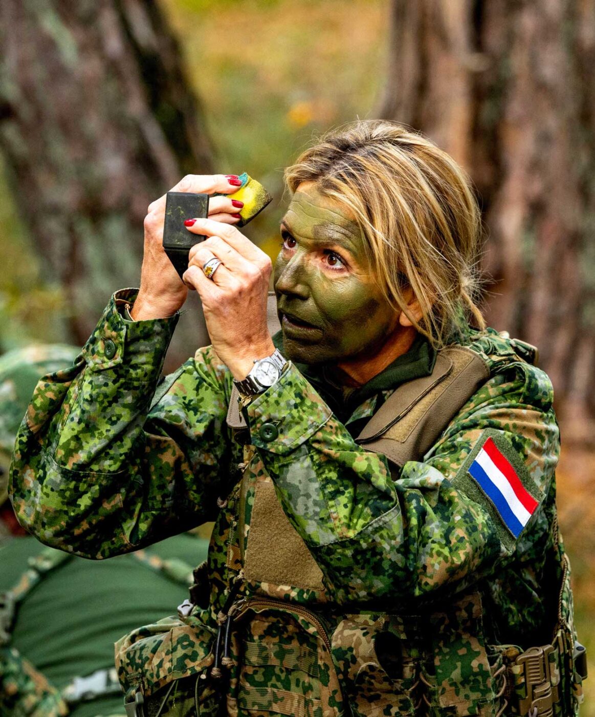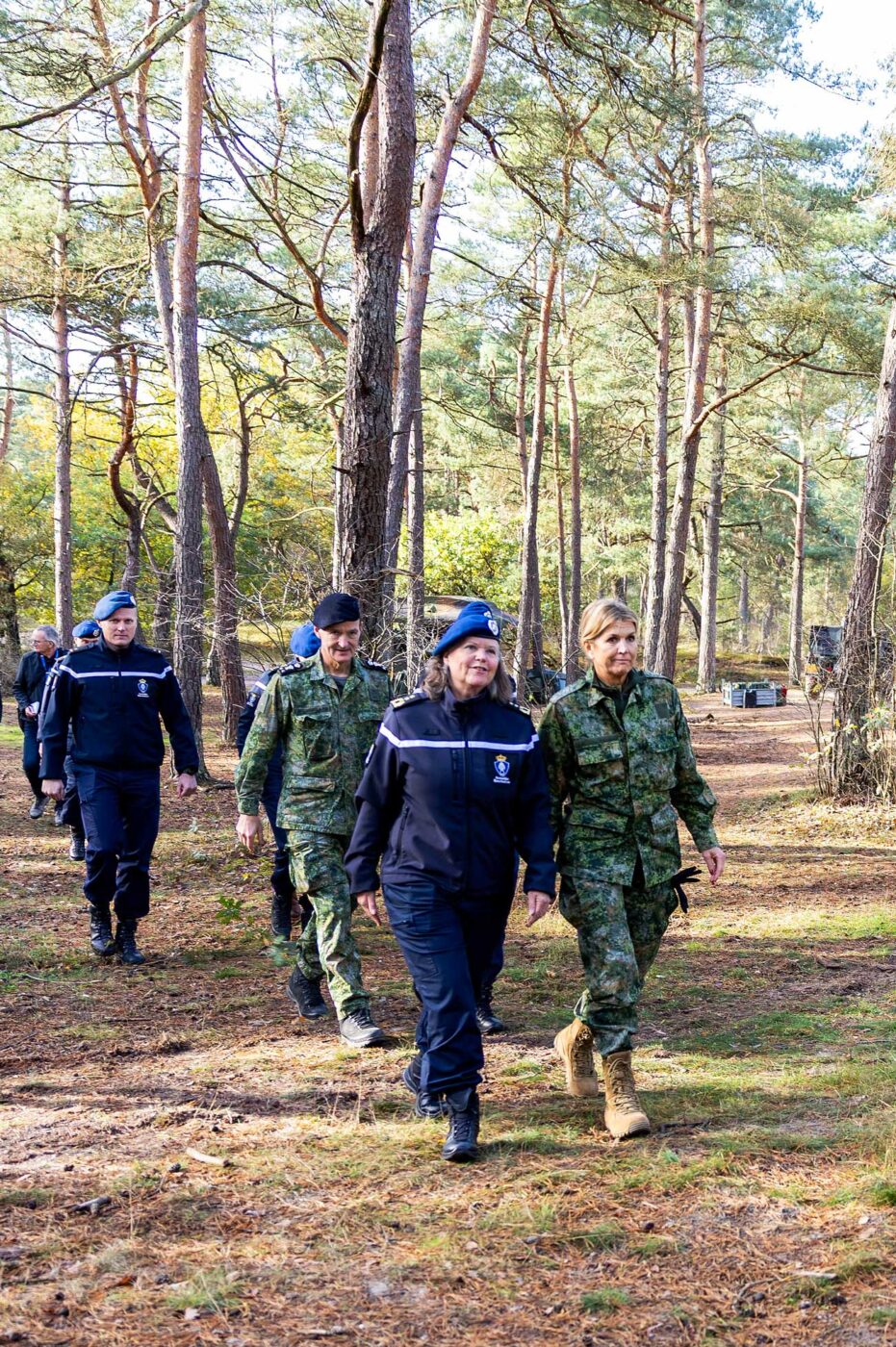 La reine Máxima des Pays-Bas a participé à un entraînement de la Maréchaussée royale, aux côtés de jeunes recrues. La reine Máxima a visité deux bivouacs et a appris les rudiments de la vie militaire. La reine a notamment appris à parfaire son maquillage de camouflage.