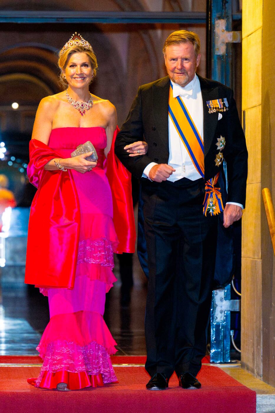 La reine Máxima assortit sa robe rose Natan à sa parure de bijoux en diamants et rubis (Photo : Patrick van Katwijk/SIPA)