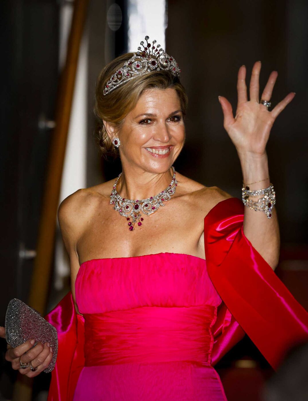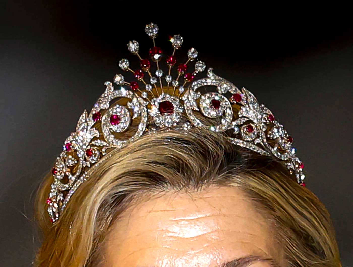 La reine Máxima porte une parure de rubis, dont le diadème queue de paon commandé par la reine Emma pour sa fille Wilhelmine (Photo : Patrick van Katwijk/SIPA)