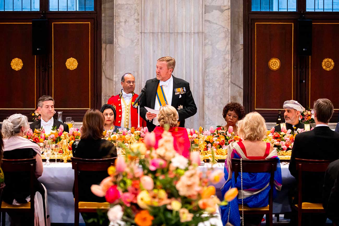 Le roi Willem-Alexander a prononcé un discours dans lequel il a rappelé l’importance accordée à ce dîner annuel. « C’est pour nous une façon de vous témoigner notre reconnaissance pour votre travail essentiel et de vous donner l’occasion de faire connaissance et d’échanger sur les sujets qui vous tiennent à cœur », a déclaré le chef de l’État. « Et il y a de nombreux sujets urgents à aborder. Vraiment beaucoup. La situation actuelle est préoccupante. Certains d’entre vous, présents ce soir, auront le cœur lourd en pensant à la situation dans leurs pays d’origine. »