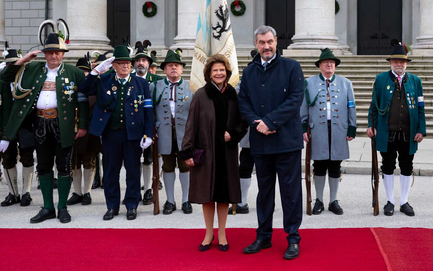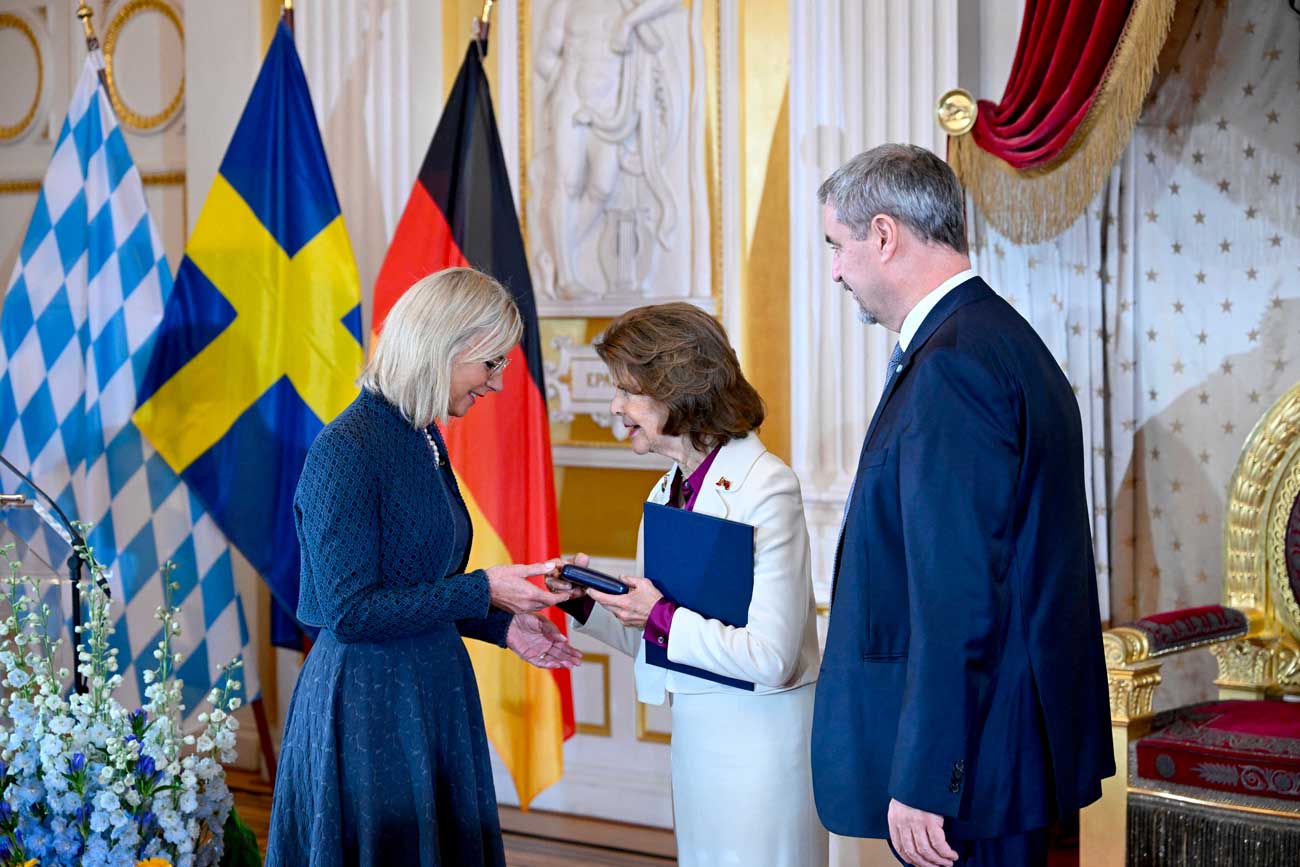 Le ministre-président de Bavière, Markus Söder, a accueilli à la reine de Suède au palais de la Résidence, pour lui remettre la médaille du Mérite pour service social de l’État bavarois. La remise de la médaille s’est déroulée au cours d’une cérémonie à laquelle participait aussi Ulrike Scharf, ministre de la Famille, du Travail et des Affaires sociales de Bavière.
